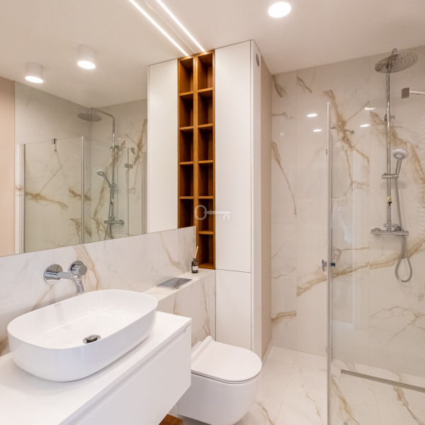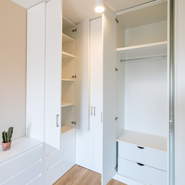 Lokal wykończony bardzo starannie, wszystkie meble – zabudowa kuchenna, szafy w sypialni, półki i szafki łazienkowe wykonane są na wymiar, zgodnie z projektem architekta.