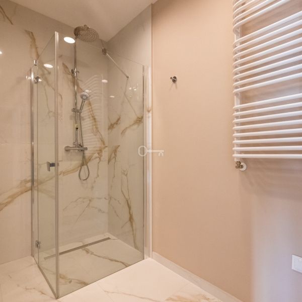 Kuchnia jest w pełni wyposażona w sprzęt AGD – lodówka, płyta indukcyjna, piekarnik, zmywarka. W łazience prysznic i gotowe podłączenie do pralki.