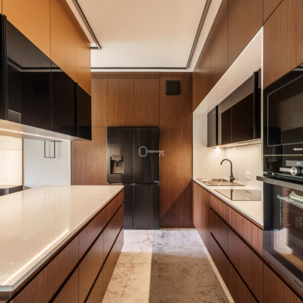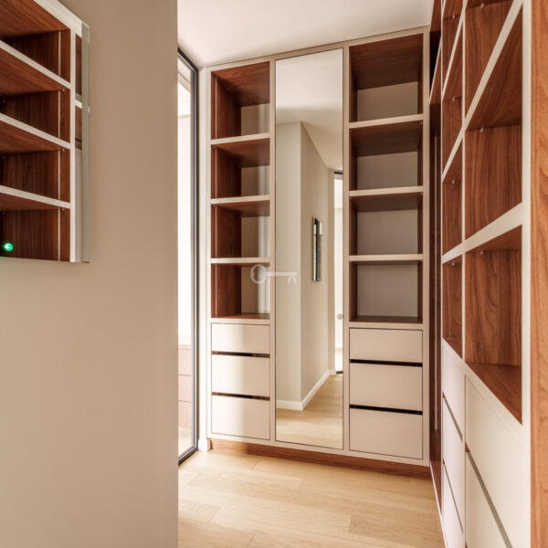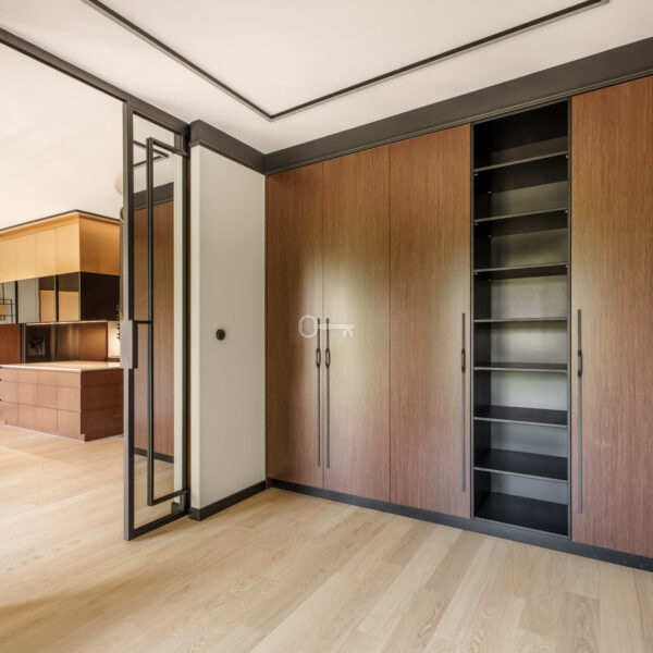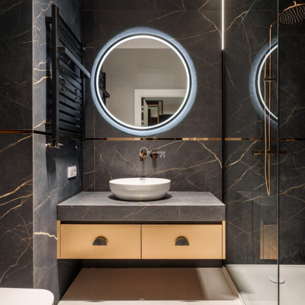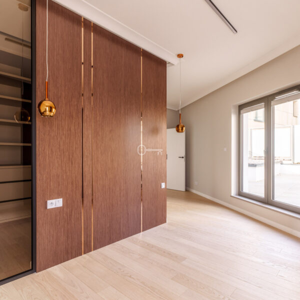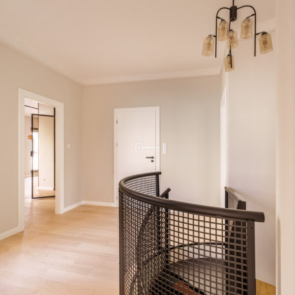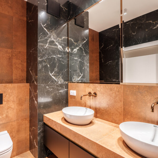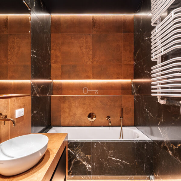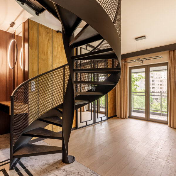 Apartament z charakterem – tak można określić to wnętrze. Elementy industrialne (np. w postaci metalowych, kręconych schodów) przeplatają się z elegancją złotych detali wykończeniowych i wysokiej jakości materiałów, dzięki czemu uzyskano efekt loftu w wersji glamour.