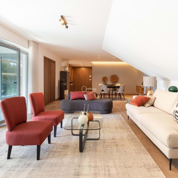 Jedną z głównych atrakcji tego przestronnego apartamentu z 4 sypialniami jest również duży taras o powierzchni około 18 metrów kwadratowych, który rozciąga się od salonu, zapewniając przyjemną przestrzeń do korzystania z zewnątrz, relaksu, a nawet przyjmowania gości.