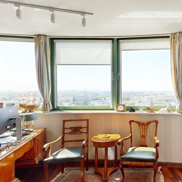 * Imponujący widok: Lokal znajduje się na ostatnim piętrze, oferując zapierający dech w piersiach widok na panoramę Warszawy z trzech stron świata.