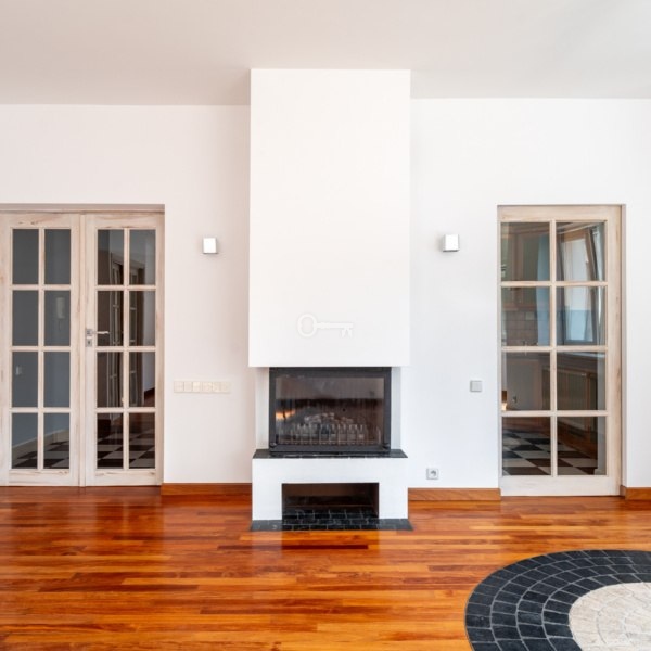 * salon z wykuszem i kominkiem
