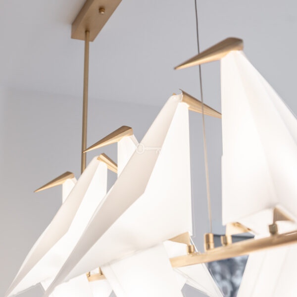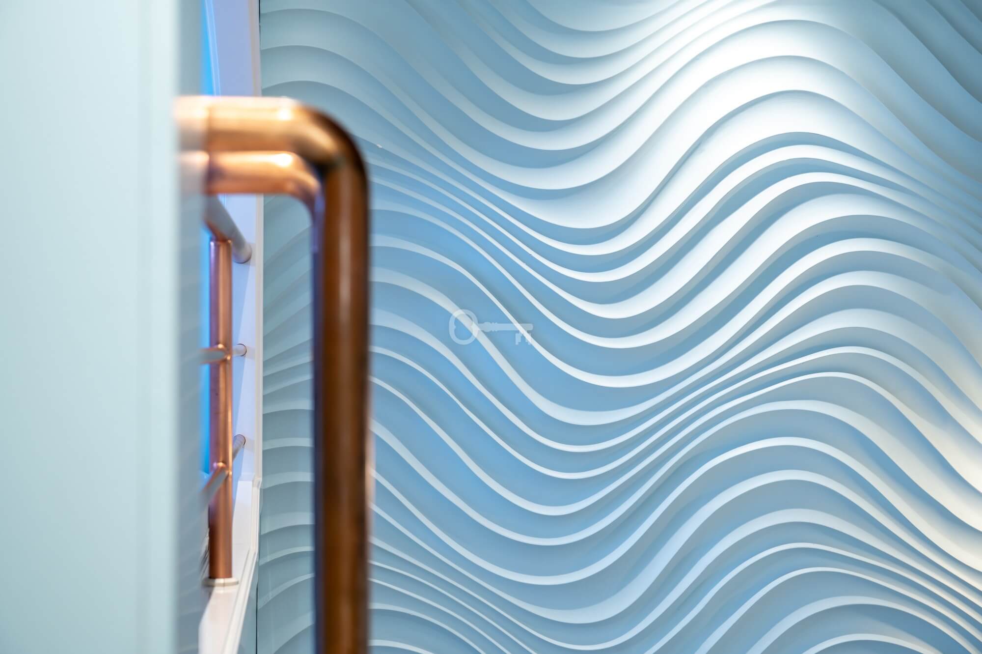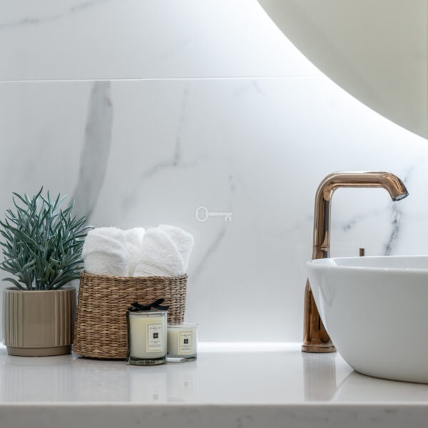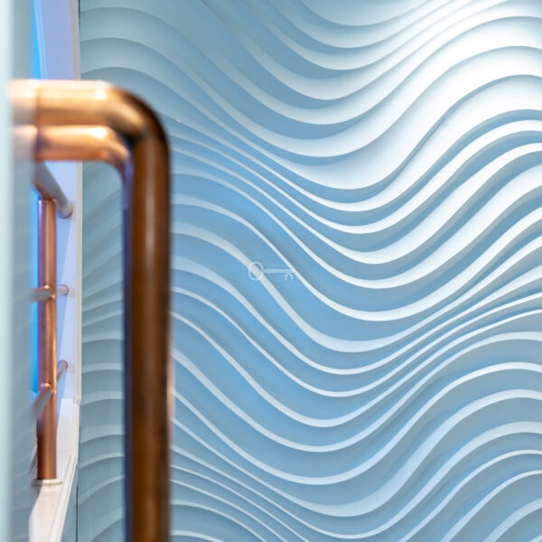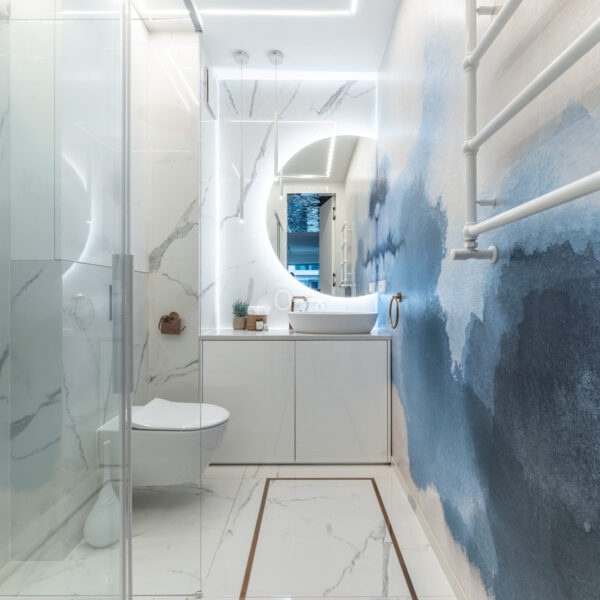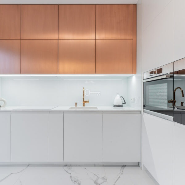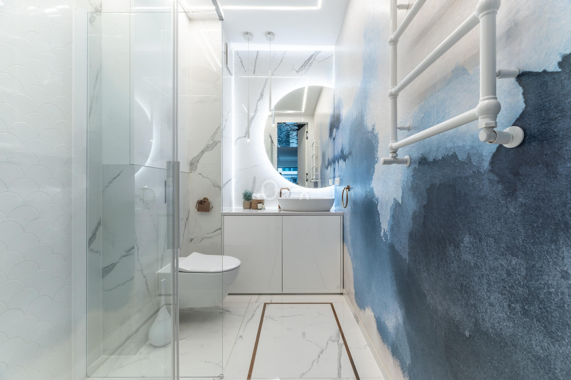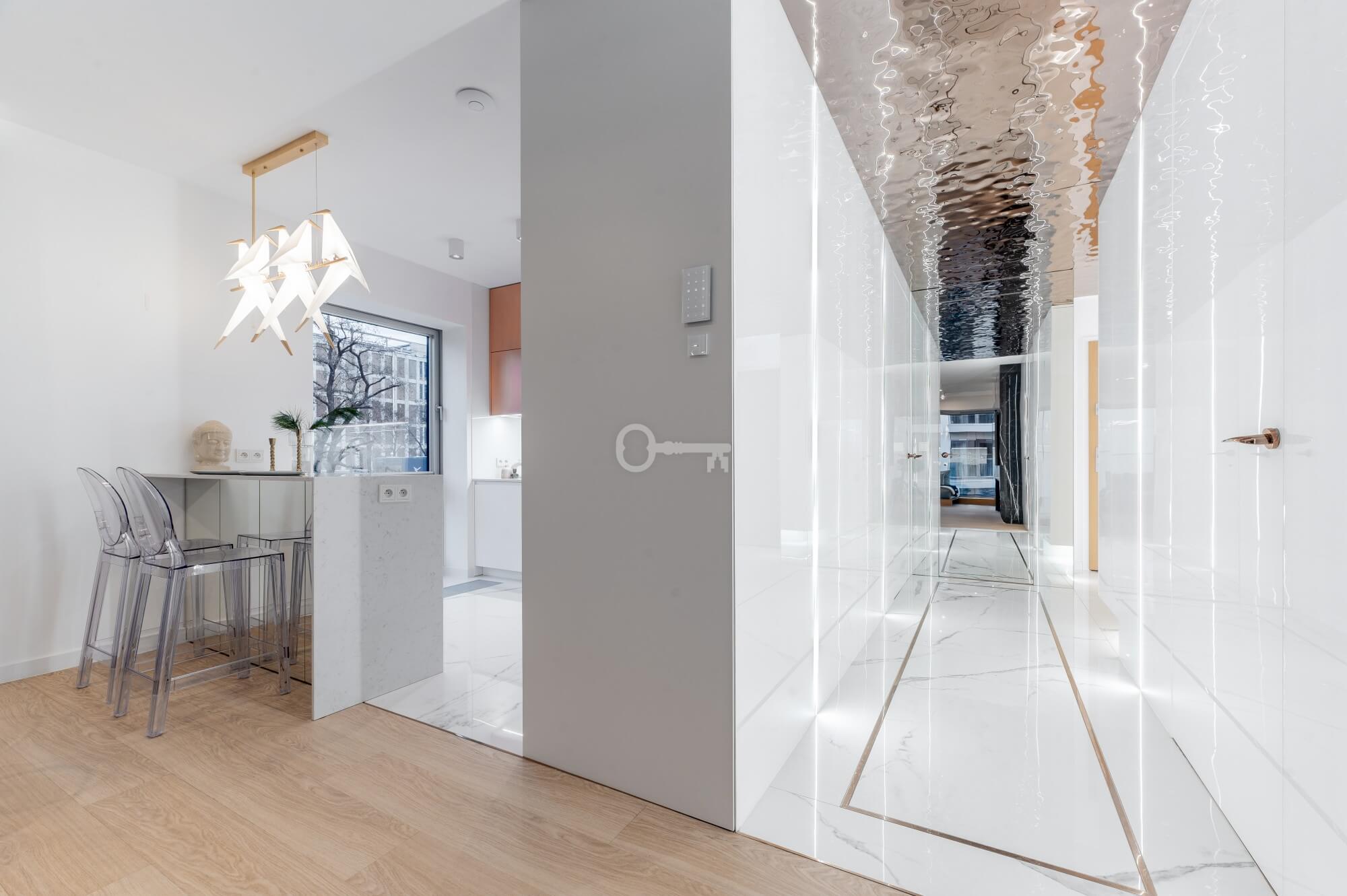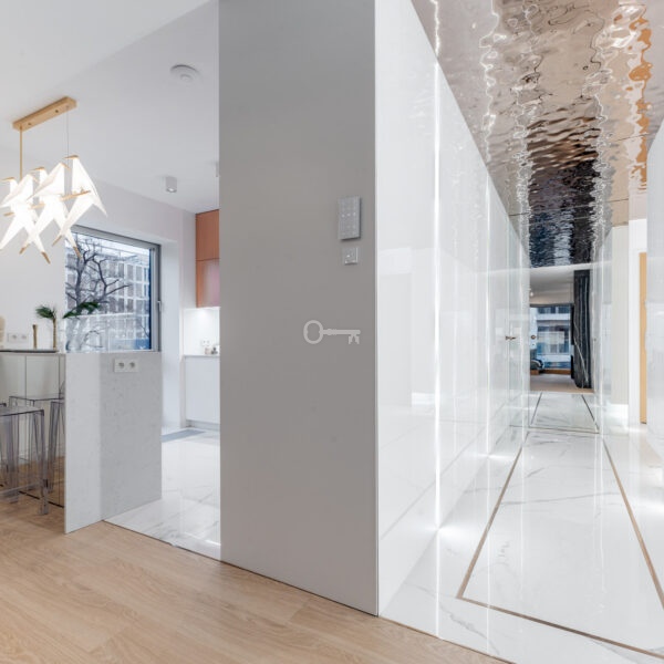 Wysoka stolarka drzwiowa o niestandardowej wysokości nadaje wnętrzom monumentalny charakter. Podłogi wykonano z wielkoformatowego gresu ze złotymi listwami dekoracyjnymi, a ściany wykończono w wysokim połysku (High Gloss). System pionowych linii LED ukrytych w panelach ściennych subtelnie podkreśla architekturę wnętrza i buduje elegancki nastrój. System ogrzewania został całkowicie ukryty w podłodze, zapewniając komfort cieplny przy jednoczesnym zachowaniu pełnej swobody aranżacji ścian.