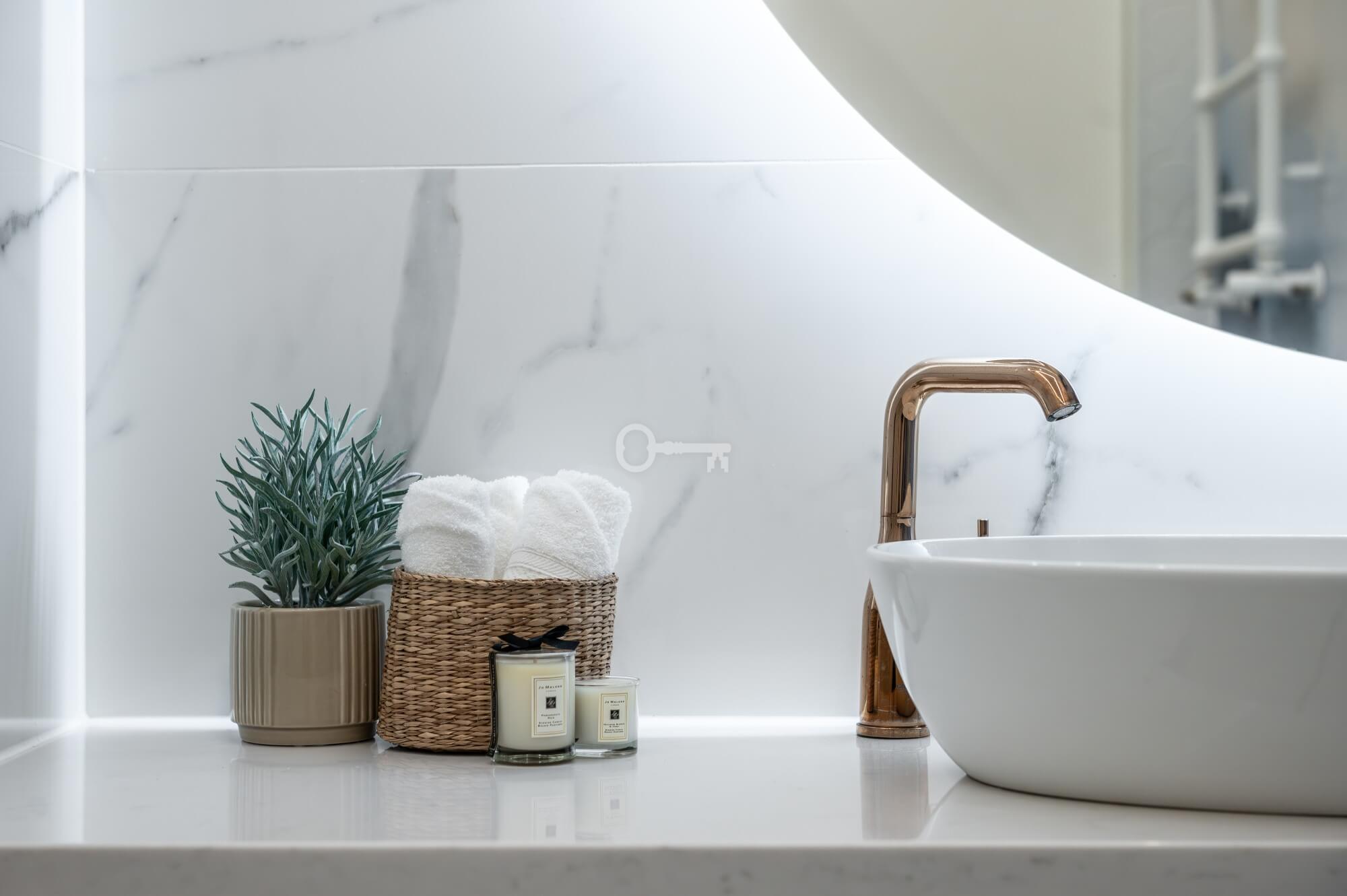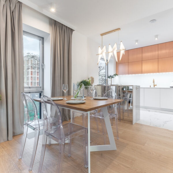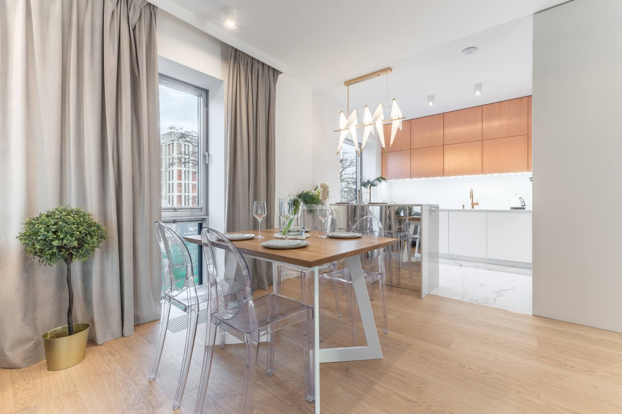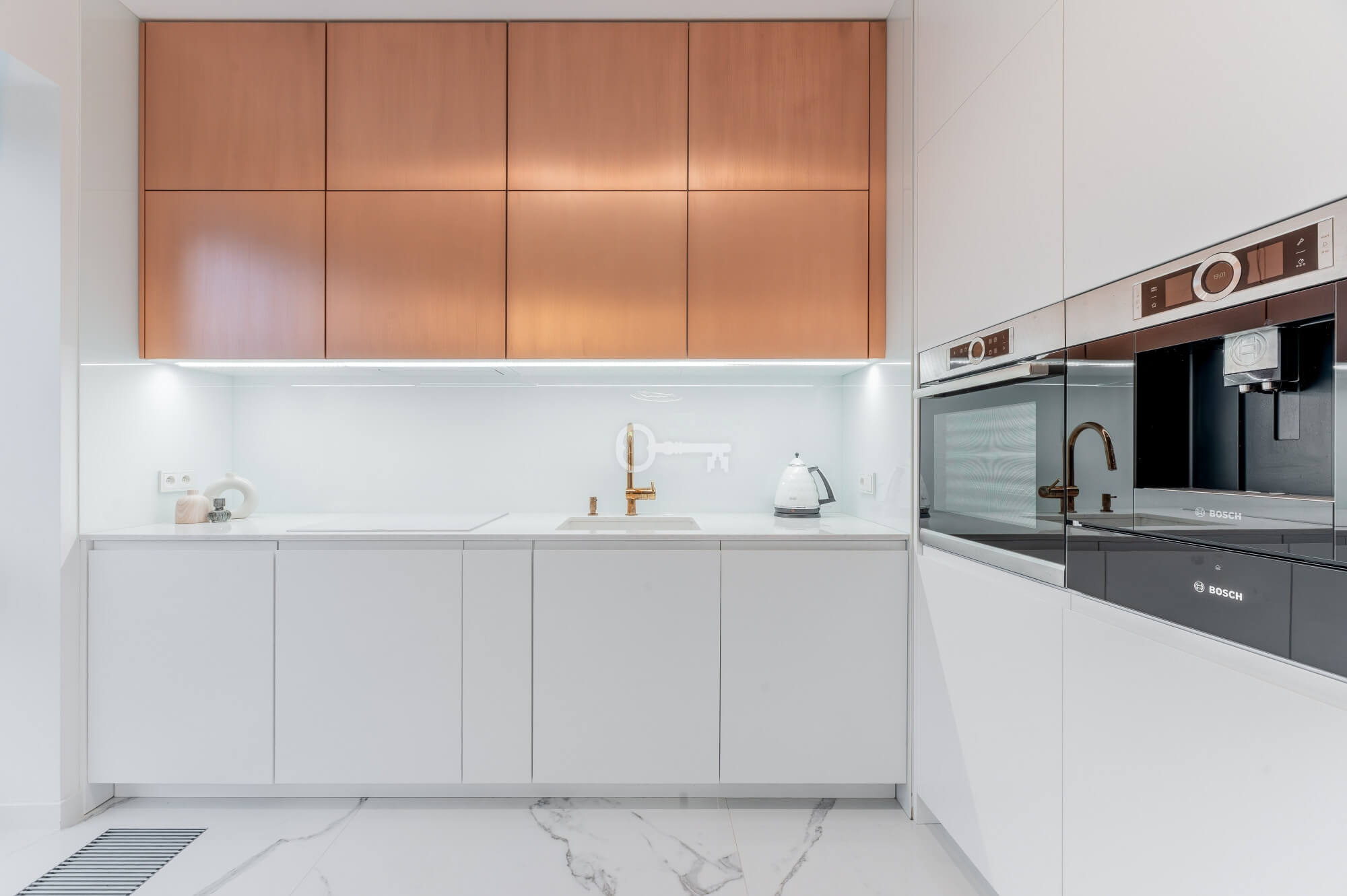 Kuchnia została wyposażona w najwyższej klasy sprzęt marki Bosch w zabudowie oraz luksusowe kamienne blaty, które podkreślają prestiżowy charakter przestrzeni.