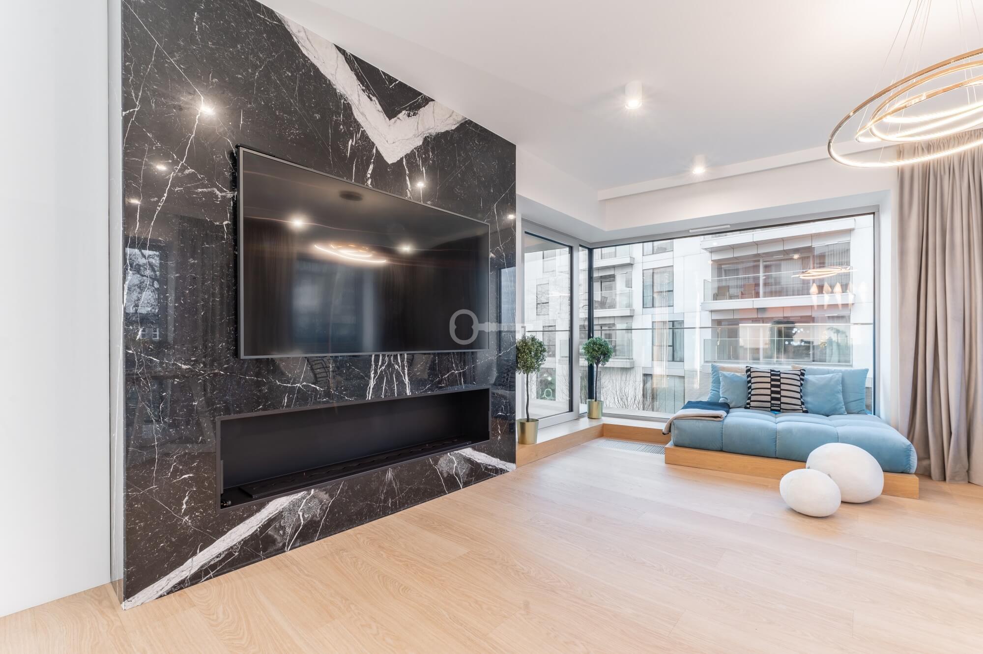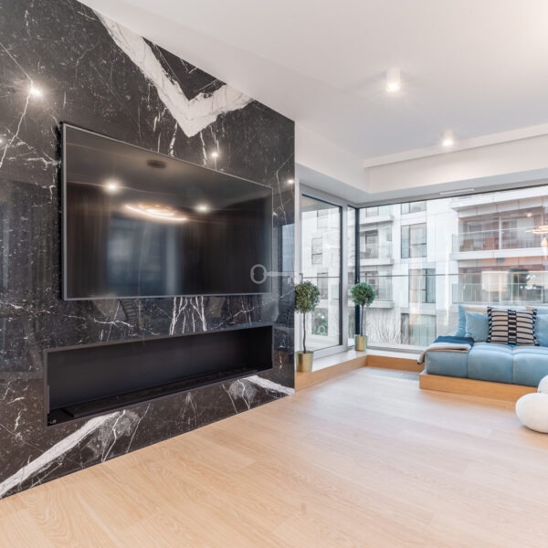 Centralnym punktem salonu jest reprezentacyjna ściana wykończona naturalnym marmurem, łącząca ponadczasową elegancję z nowoczesną technologią. Zabudowany biokominek w strefie wypoczynkowej nadaje wnętrzu przytulności i sprzyja relaksowi.