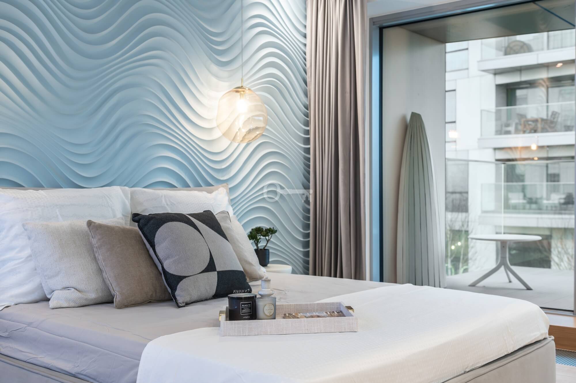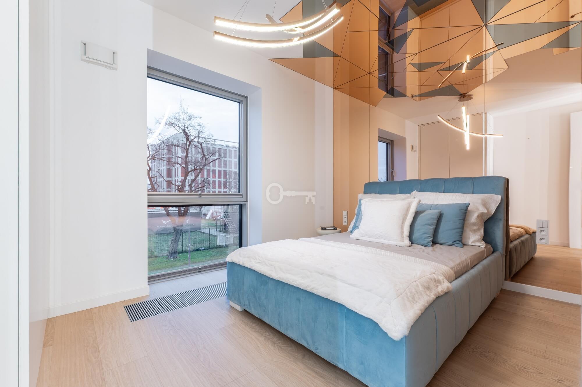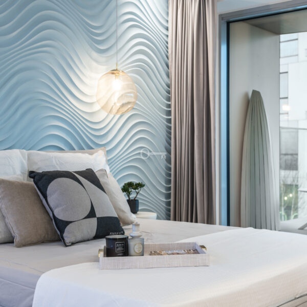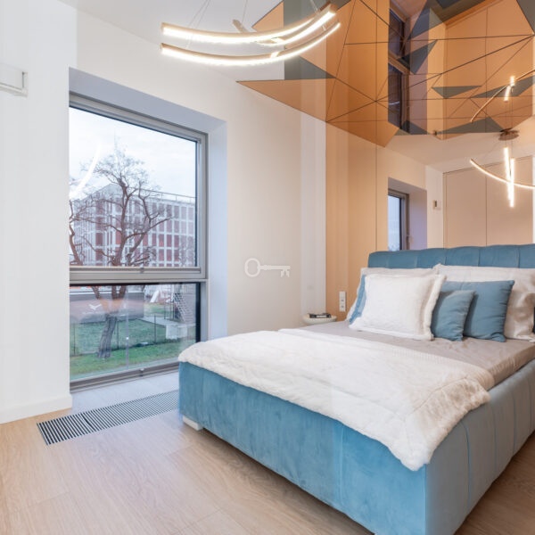 Sypialnia Master stanowi prywatną strefę komfortu, wyróżniającą się unikalnym sufitem napinanym, a harmonię wnętrza dopełniają dyskretnie ukryte gniazda elektryczne. W drugiej sypialni zastosowano designerską, geometryczną mozaikę, która płynnie przechodzi na sufit, tworząc spójną i nowoczesną kompozycję.