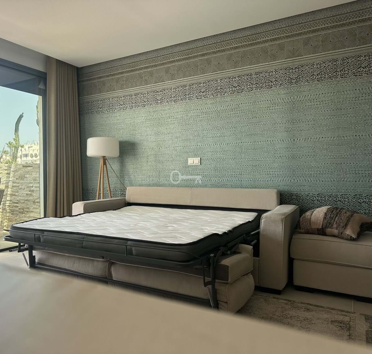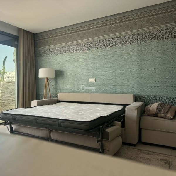 Aby zapewnić optymalny klimat w pomieszczeniach, apartament jest wyposażony w energooszczędny system pompy ciepła, który zapewnia zarówno chłodzenie, jak i ogrzewanie. W salonie znajduje się również rozkładana sofa i okiennice, dzięki czemu idealnie nadaje się jako dodatkowe miejsce do spania.