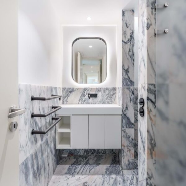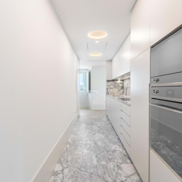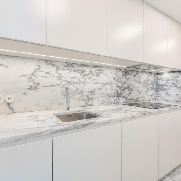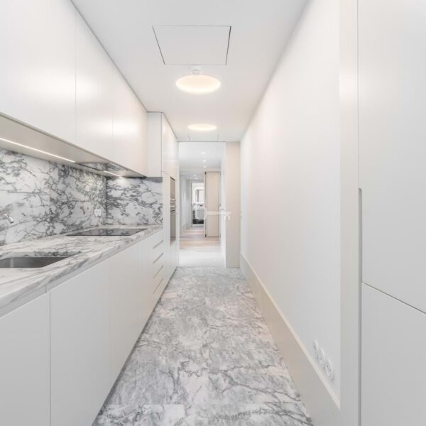 – Integrated kitchens with lacquered finishes and Portuguese marble countertops
