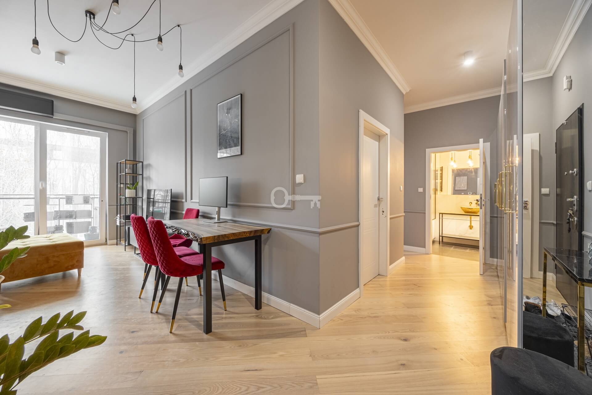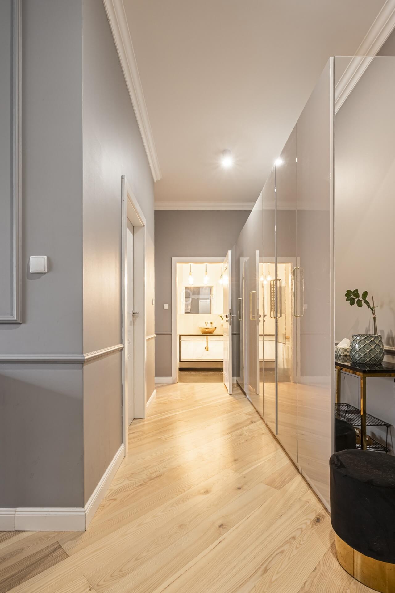 Szlachetna deska na podłogach podkreśla prestiżowy charakter wnętrza.