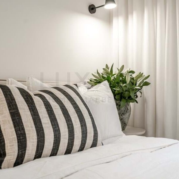 The property offers two comfortable bedrooms, each with its own beautifully finished bathroom. The entire apartment features a brand-new stylish floor and plenty of smart storage solutions, including custom-made wardrobes. There is also a separate storage and laundry area with extra cupboards and a neatly integrated built-in washing machine.