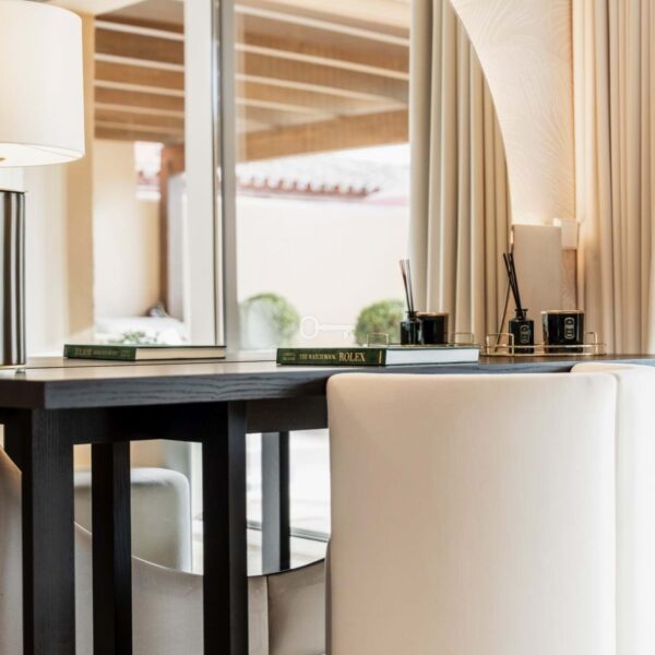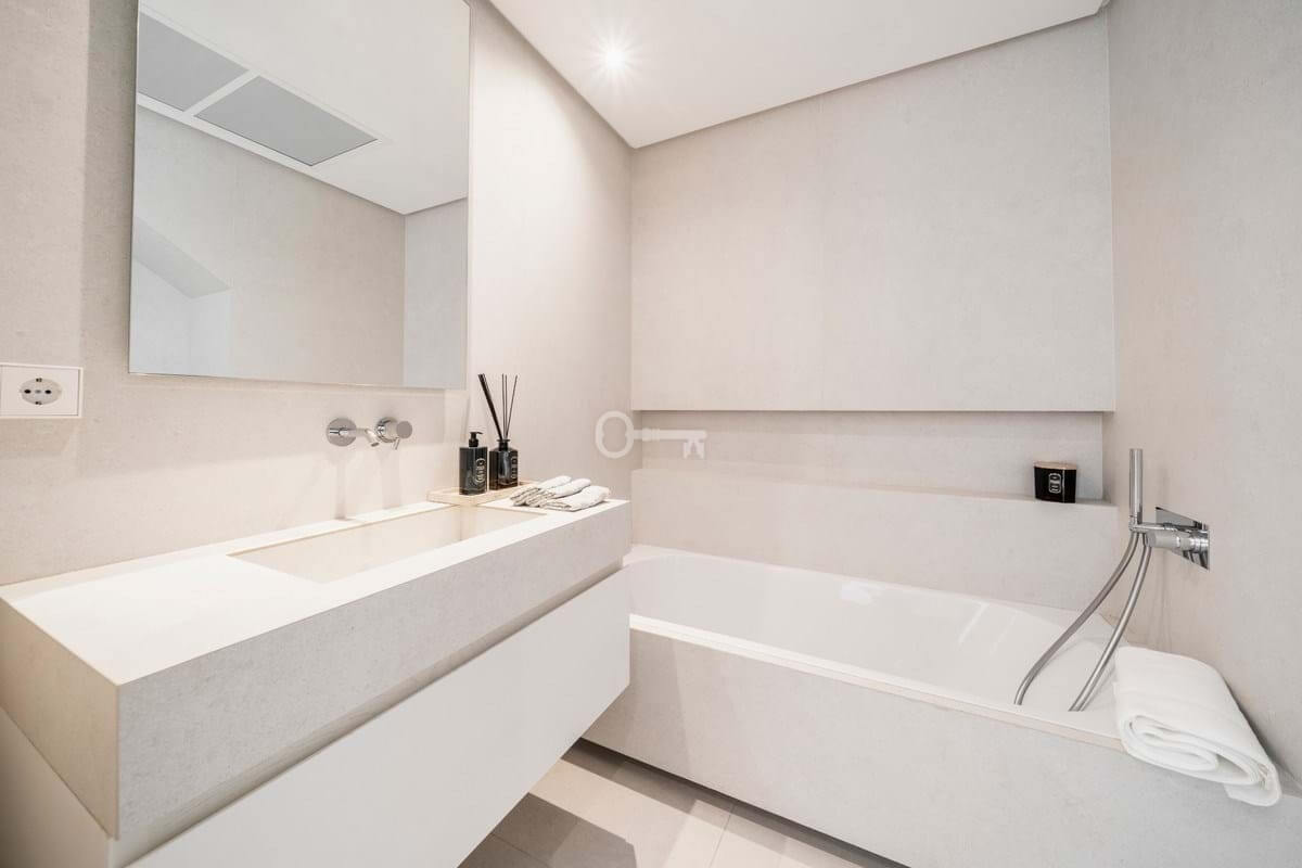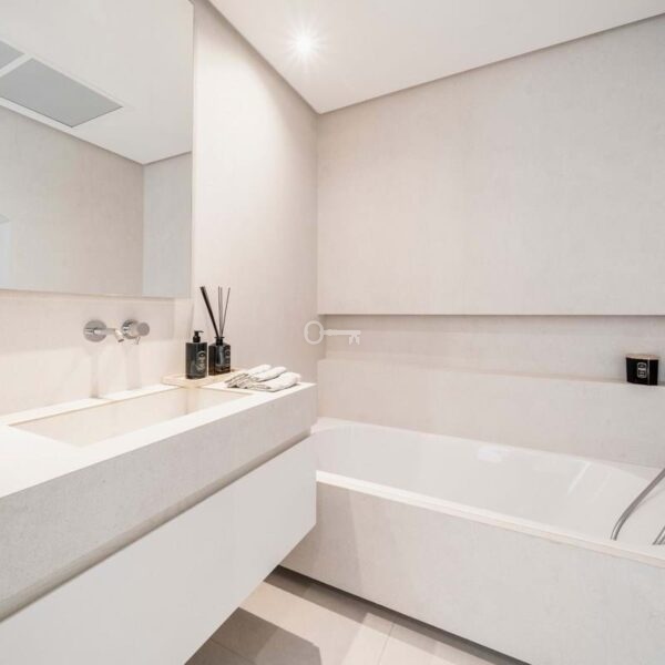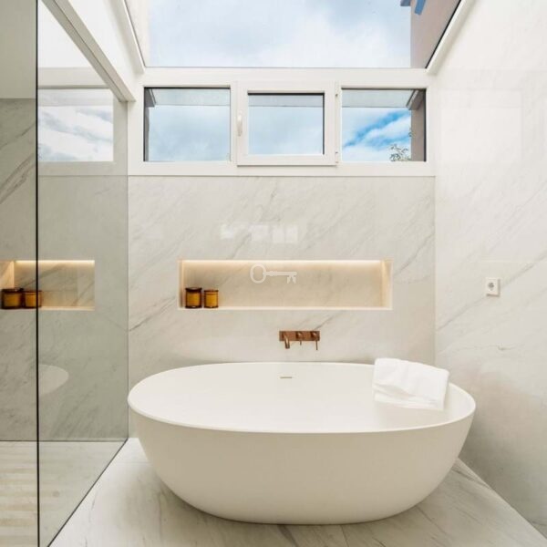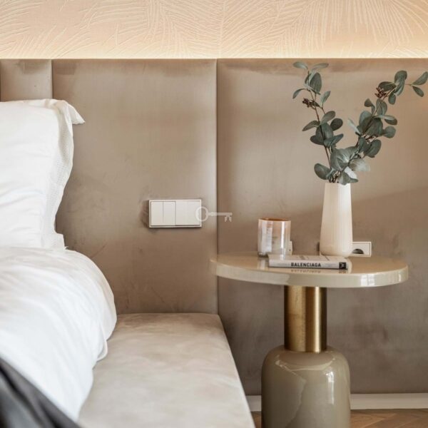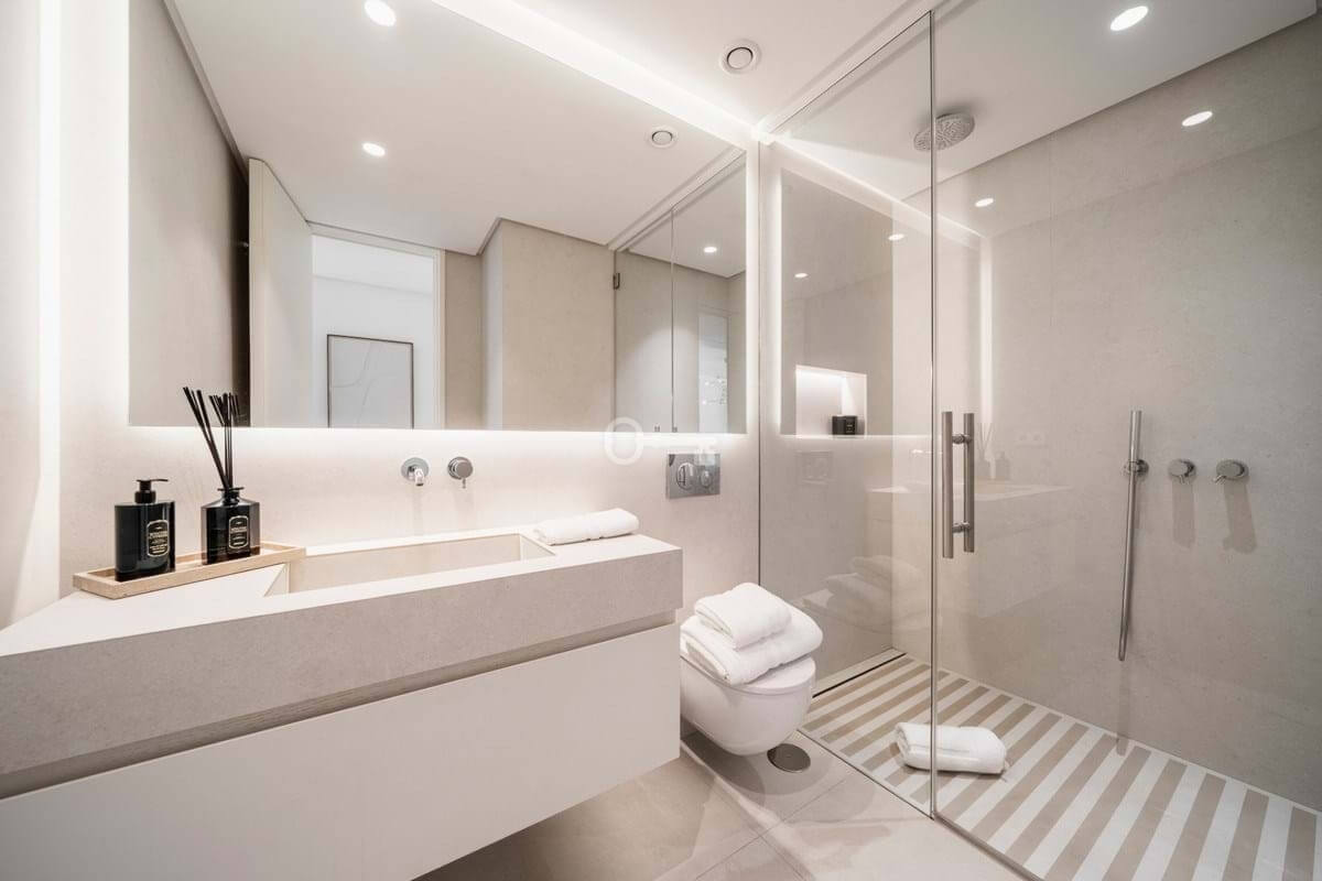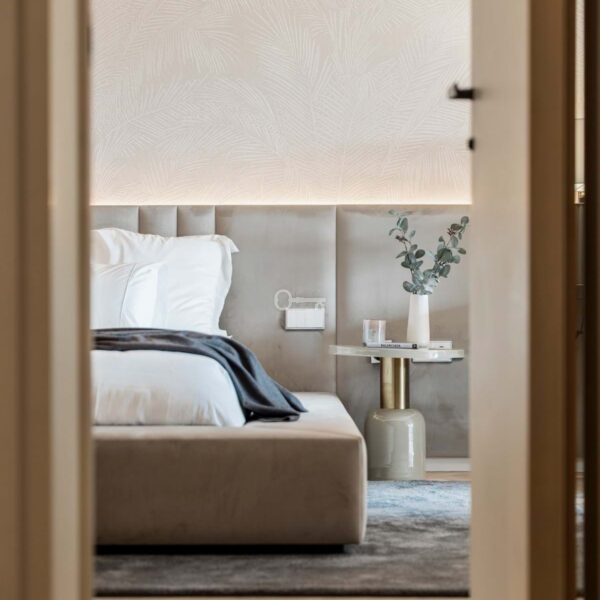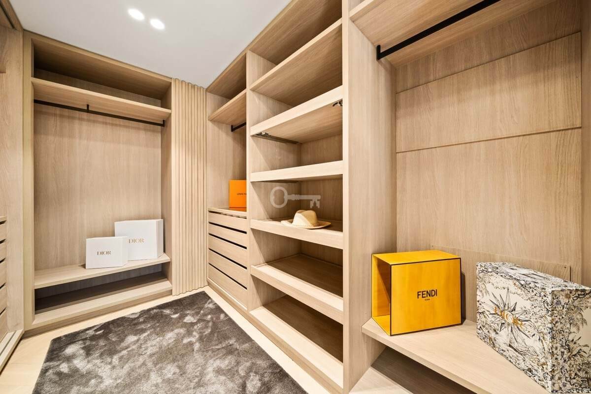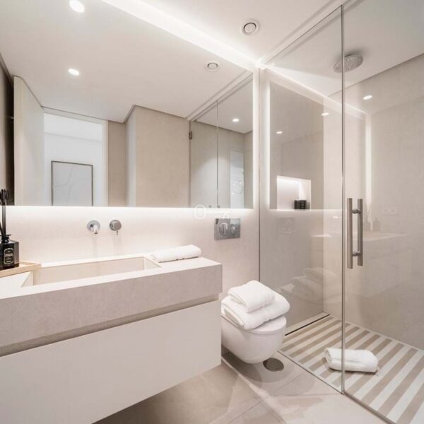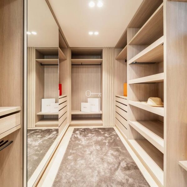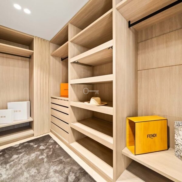 The penthouse offers three spacious en-suite bedrooms, each designed with serene Mediterranean tones for a calming retreat. The master bedroom boasts a generous walk-in closet, providing ample storage and a luxurious dressing experience.