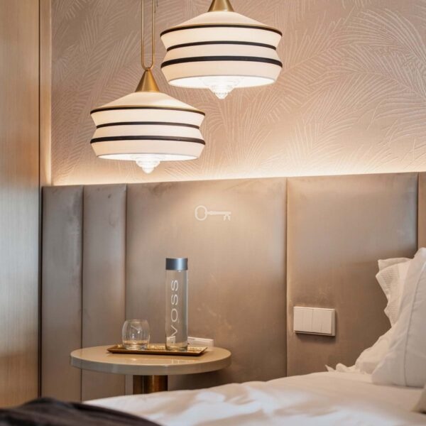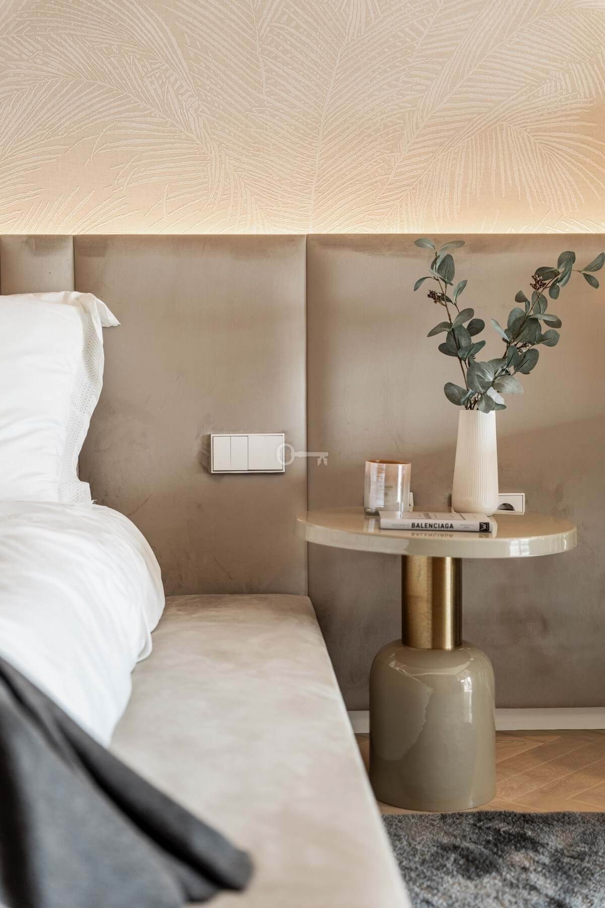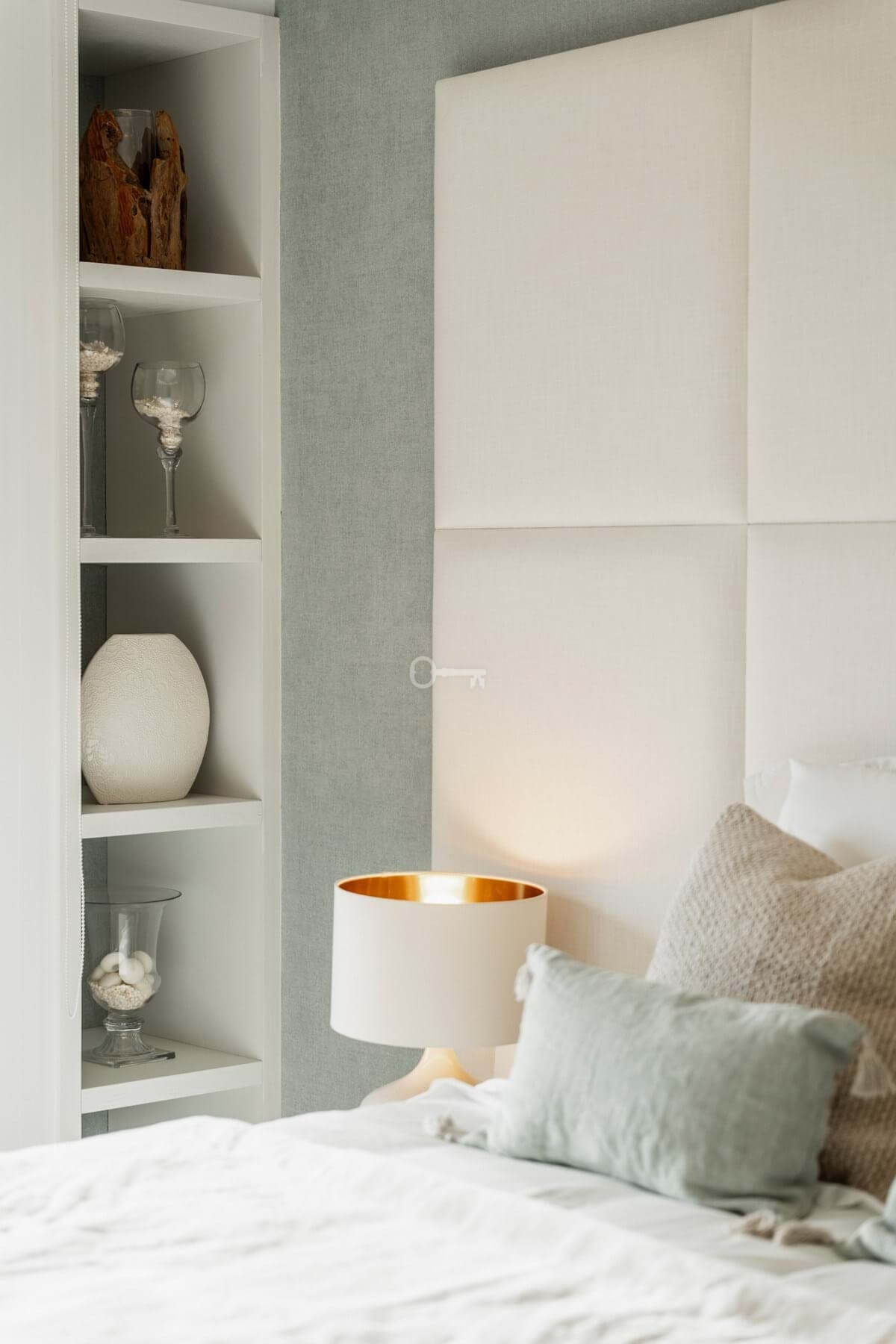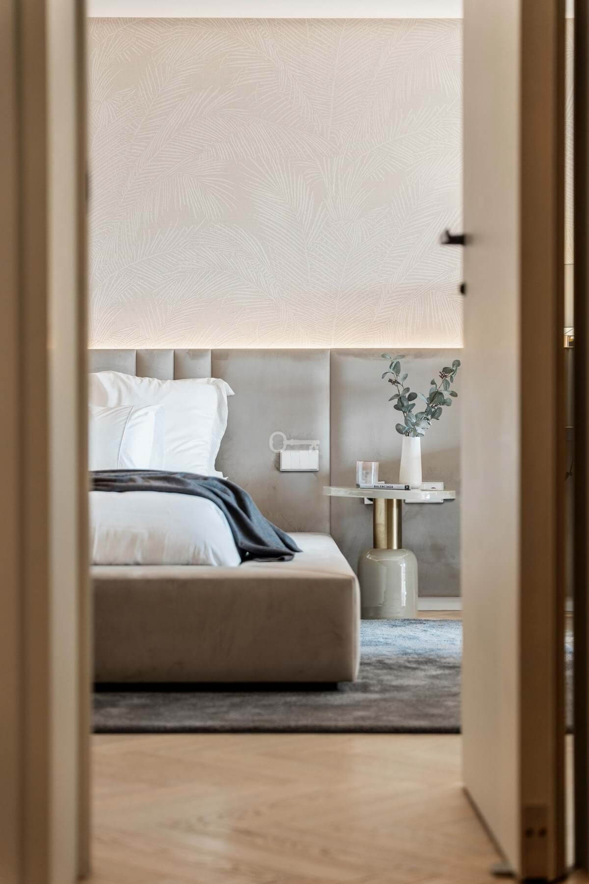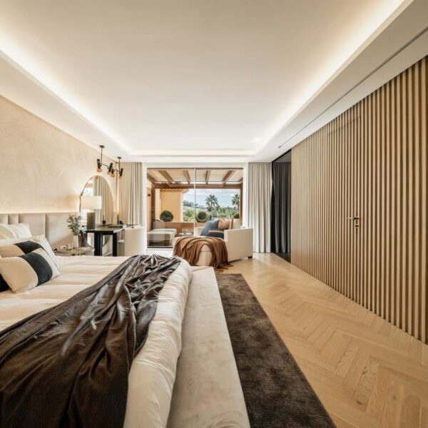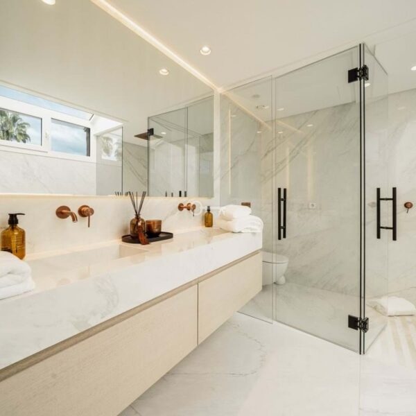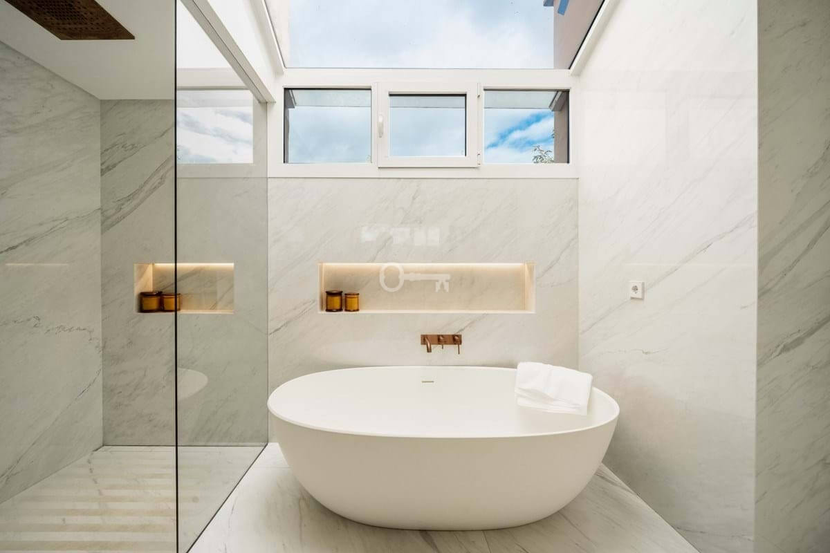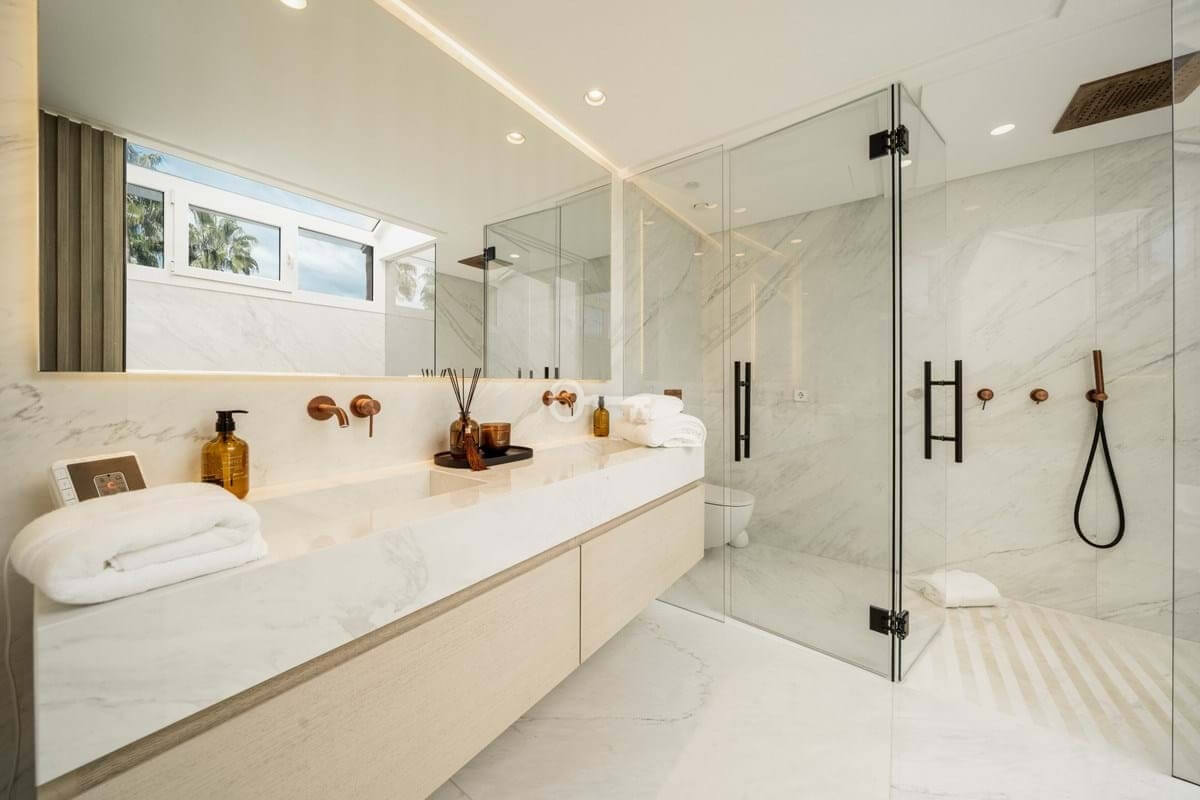The penthouse offers three spacious en-suite bedrooms, each designed with serene Mediterranean tones for a calming retreat. The master bedroom boasts a generous walk-in closet, providing ample storage and a luxurious dressing experience.