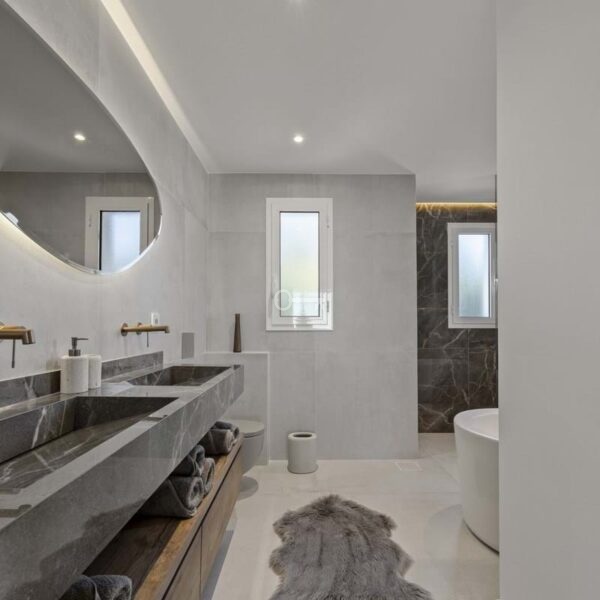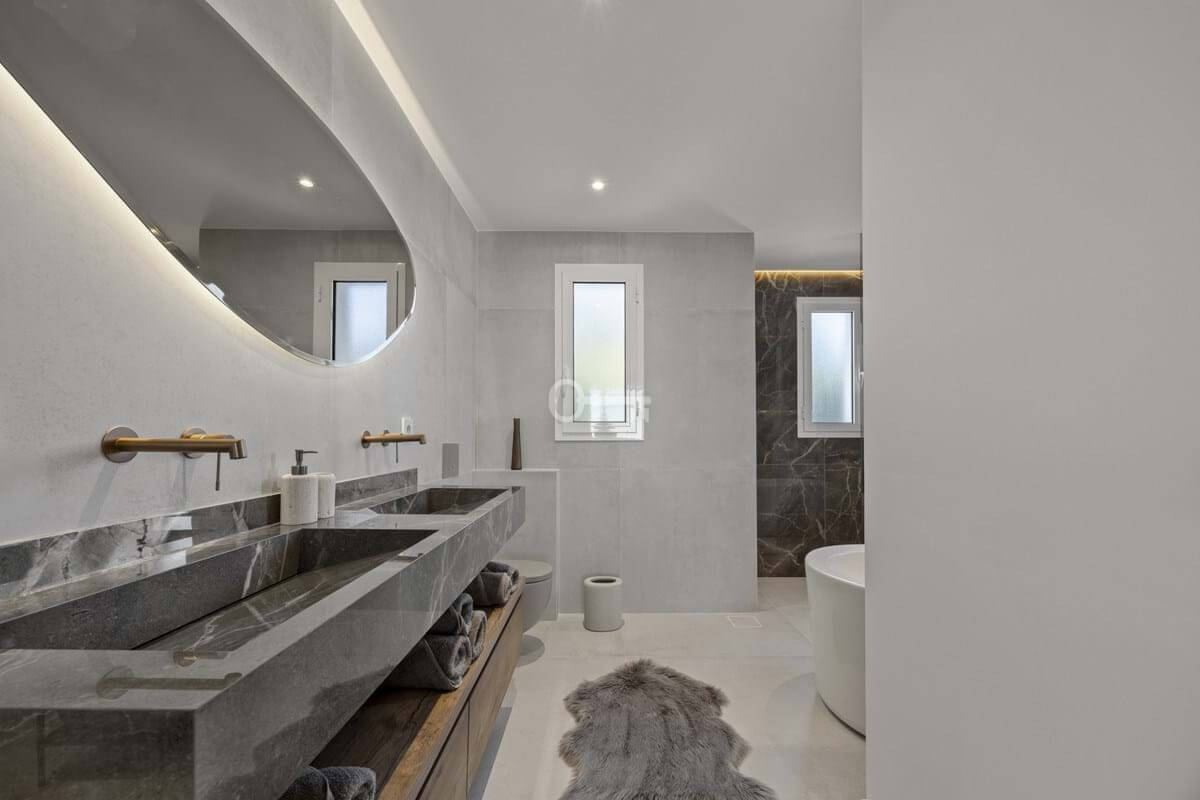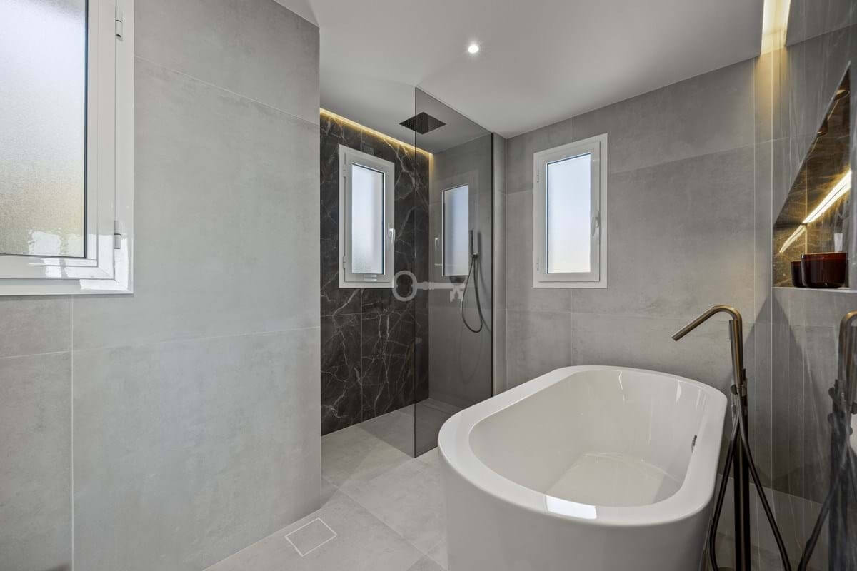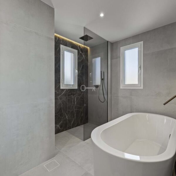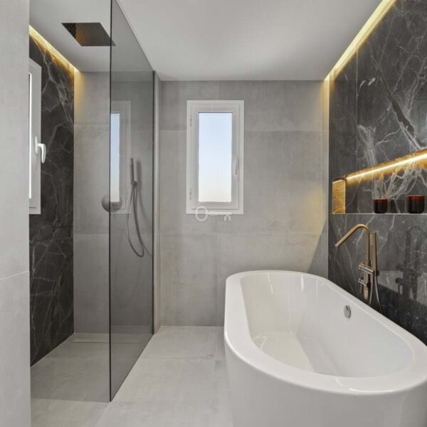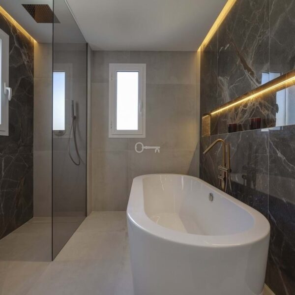 The apartment provides a total built area of 186 m², including 133 m² of interior living space and a 37 m² terrace that extends the principal rooms outward. The layout centres on an open-plan living and kitchen area, designed to promote flow between daily living and social gatherings. Clean architectural lines, recessed ceiling lighting, and neutral materials create a cohesive and modern interior expression. The kitchen integrates seamlessly with the dining and lounge areas, forming a functional core of the home. Three bedrooms are well proportioned, with two en-suite bathrooms and an additional guest toilet. Each bathroom is finished with contemporary fittings, combining practicality with understated design.