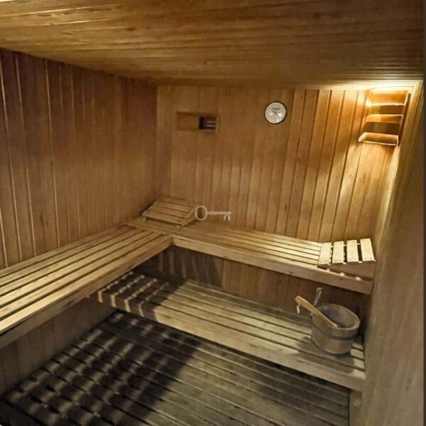 Includes a private parking space and storage room. The complex features a swimming pool, extensive landscaped gardens, a fully equipped gym, and a wellness area with jacuzzi, sauna, and steam bath.