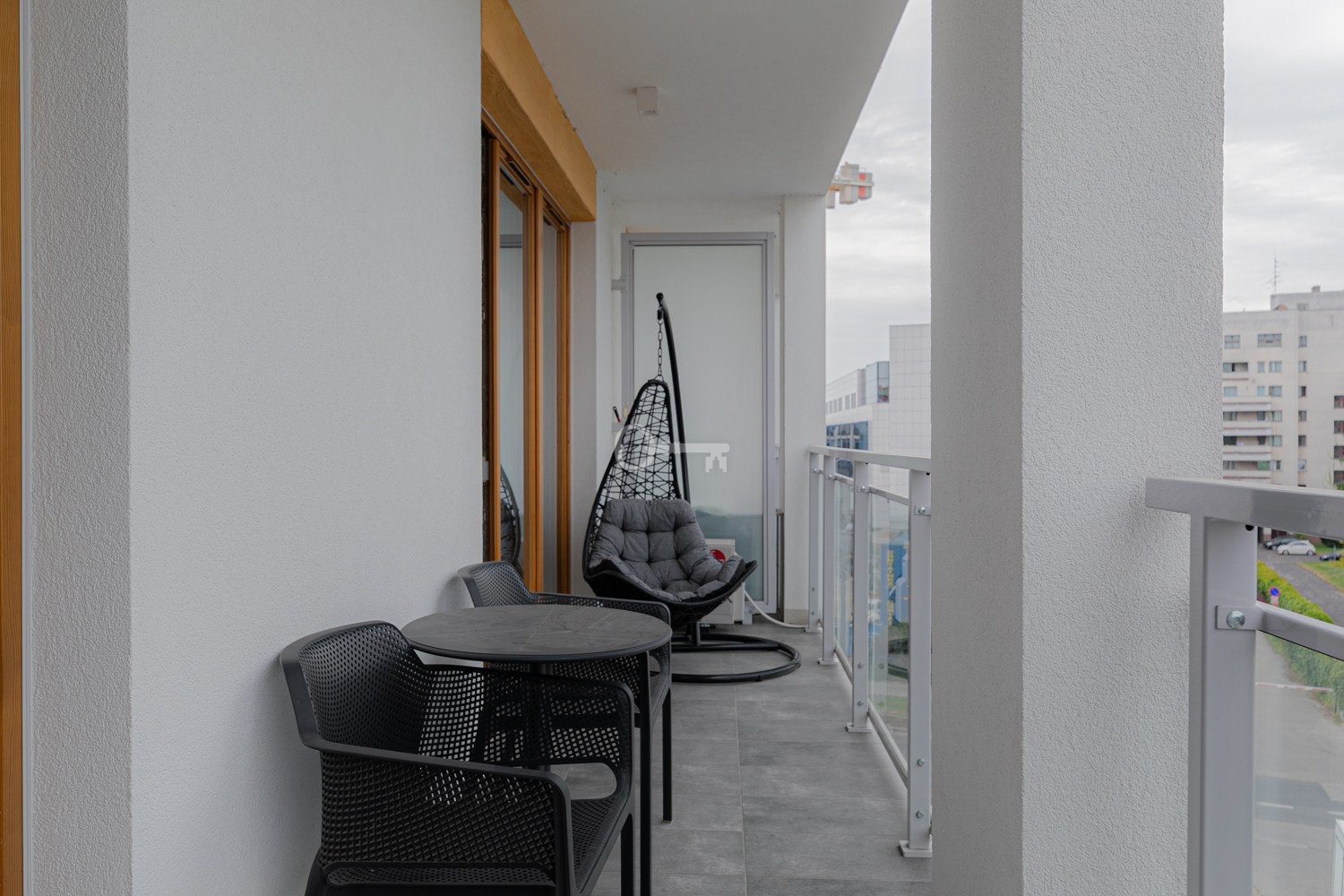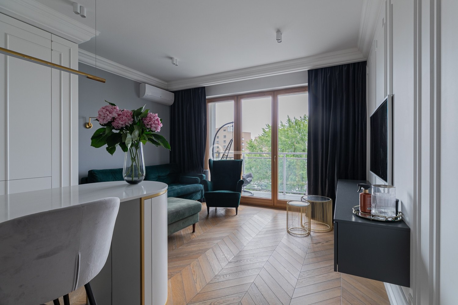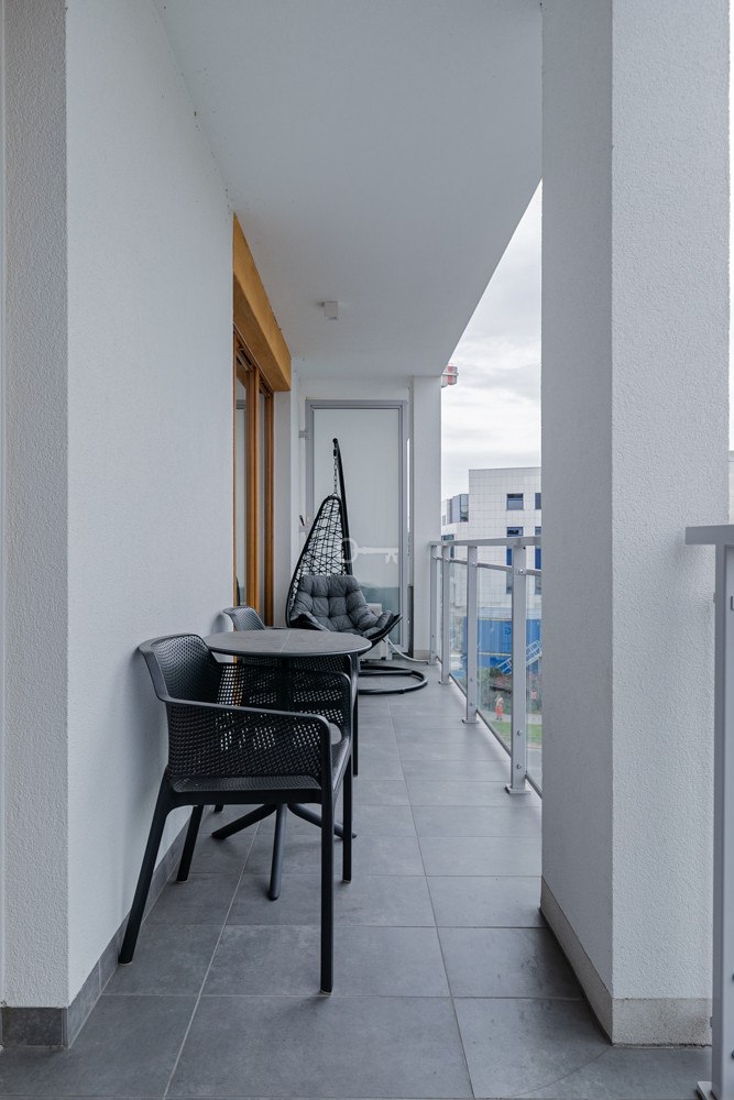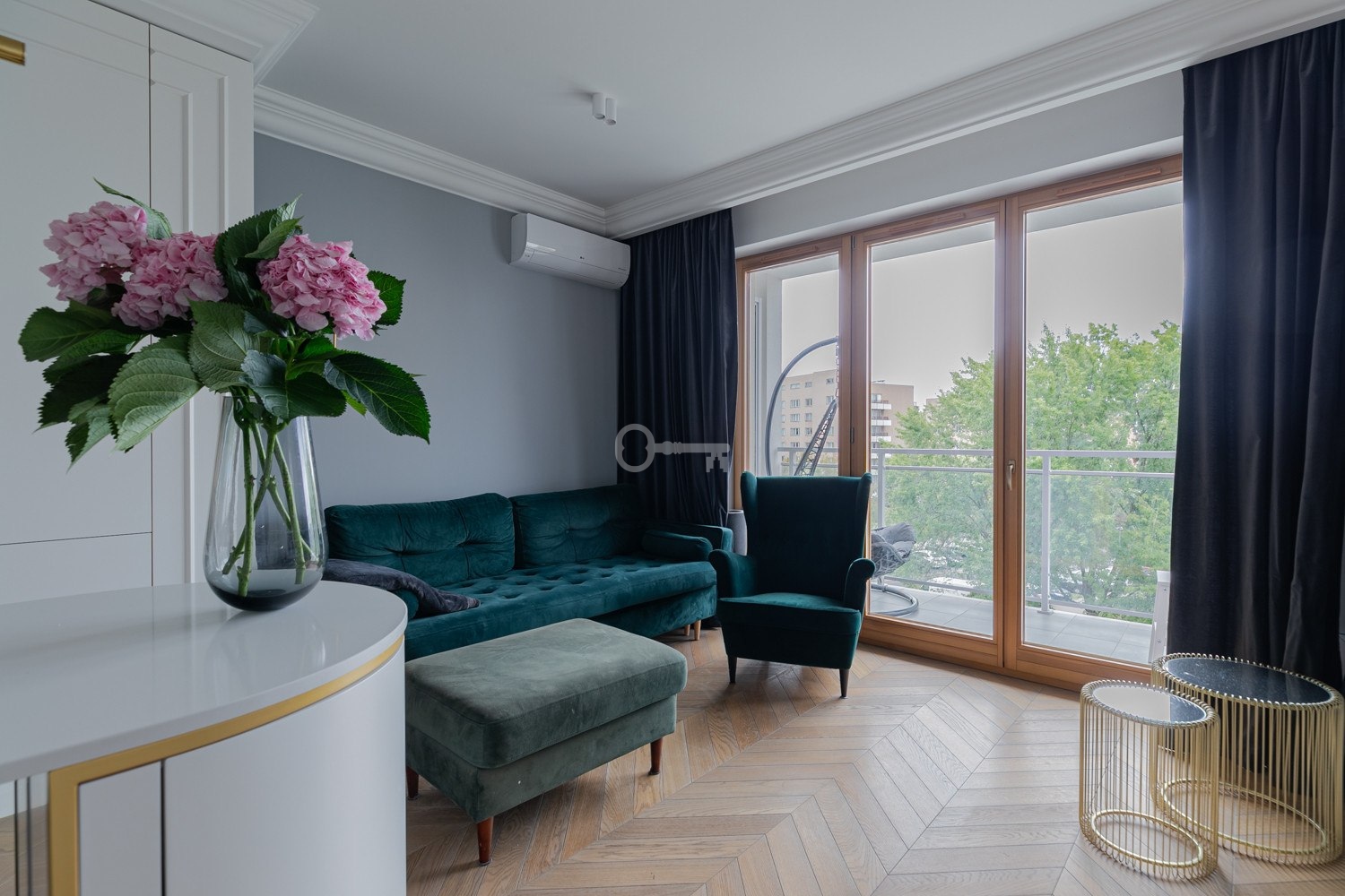 Duża loggia | Południowa ekspozycja | Drewniana podłoga | Klimatyzacja | Dolny Mokotów | Bobrowiecka | 2020 | Inwestycja Hygge Mokotów | Kompletne umeblowanie – gotowe do zamieszkania
