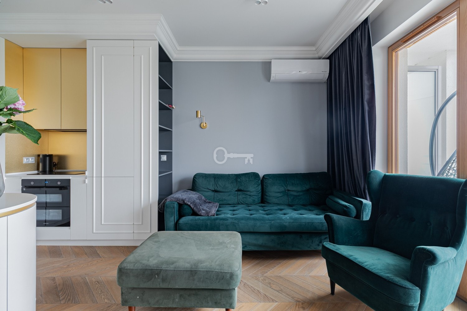 Salon wyposażony w Stylowy zestaw wypoczynkowy – kanapa, fotel, pufa. Designerskie stoliki kawowe. Szafka RTV z telewizorem Samsung Frame – sztuka spotyka technologię. Klimatyzacja dla całorocznego komfortu Kuchnia z wyspą. W pełni wyposażony aneks kuchenny ze wszystkimi niezbędnymi sprzętami AGD. Funkcjonalna wyspa zapewnia dodatkową przestrzeń roboczą – idealne rozwiązanie dla miłośników gotowania. Przemyślana ergonomia i kompletne wyposażenie sprawiają, że gotowanie staje się czystą przyjemnością.