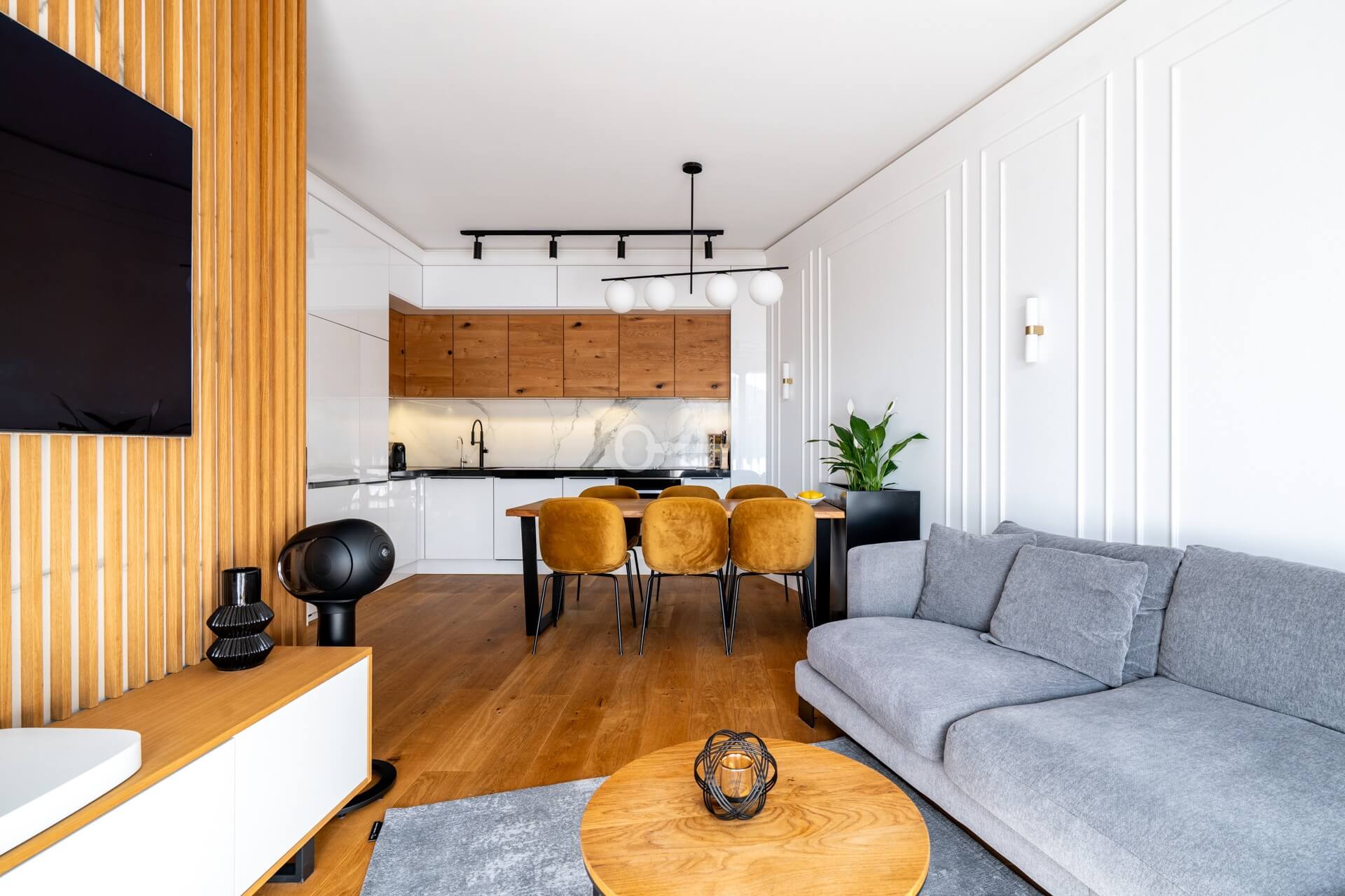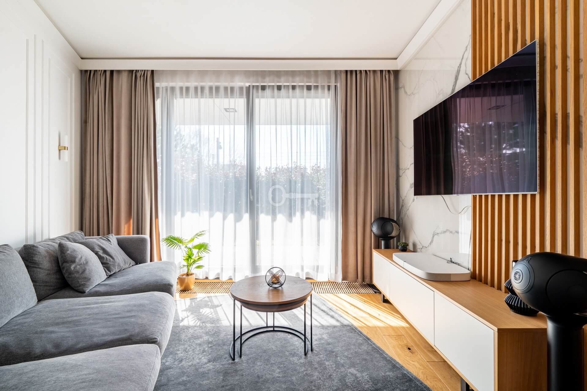 * Elegancka ściana telewizyjna z wielkoformatowych spieków kwarcowych o wzorze marmuru, uzupełniona stylowymi lamelami