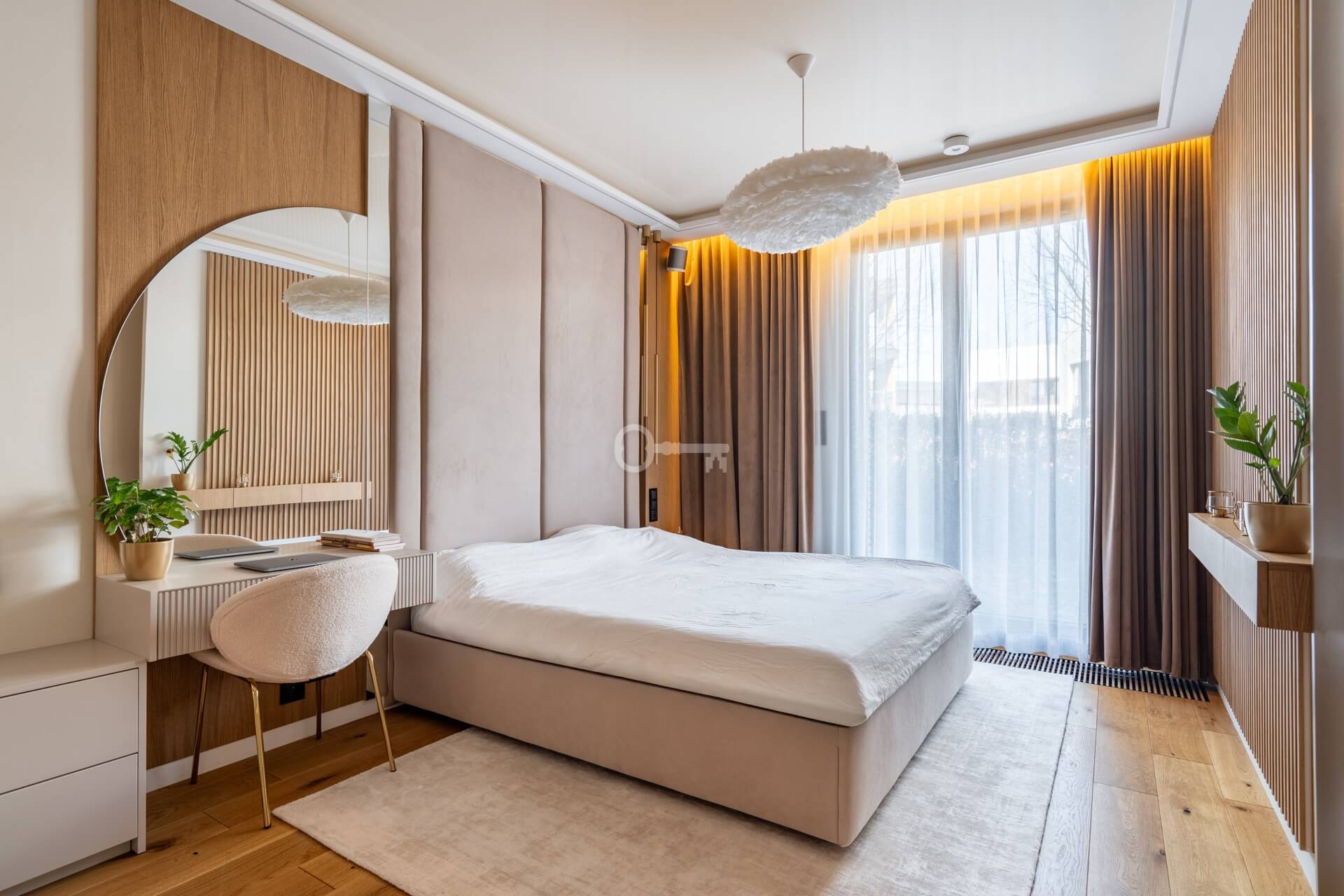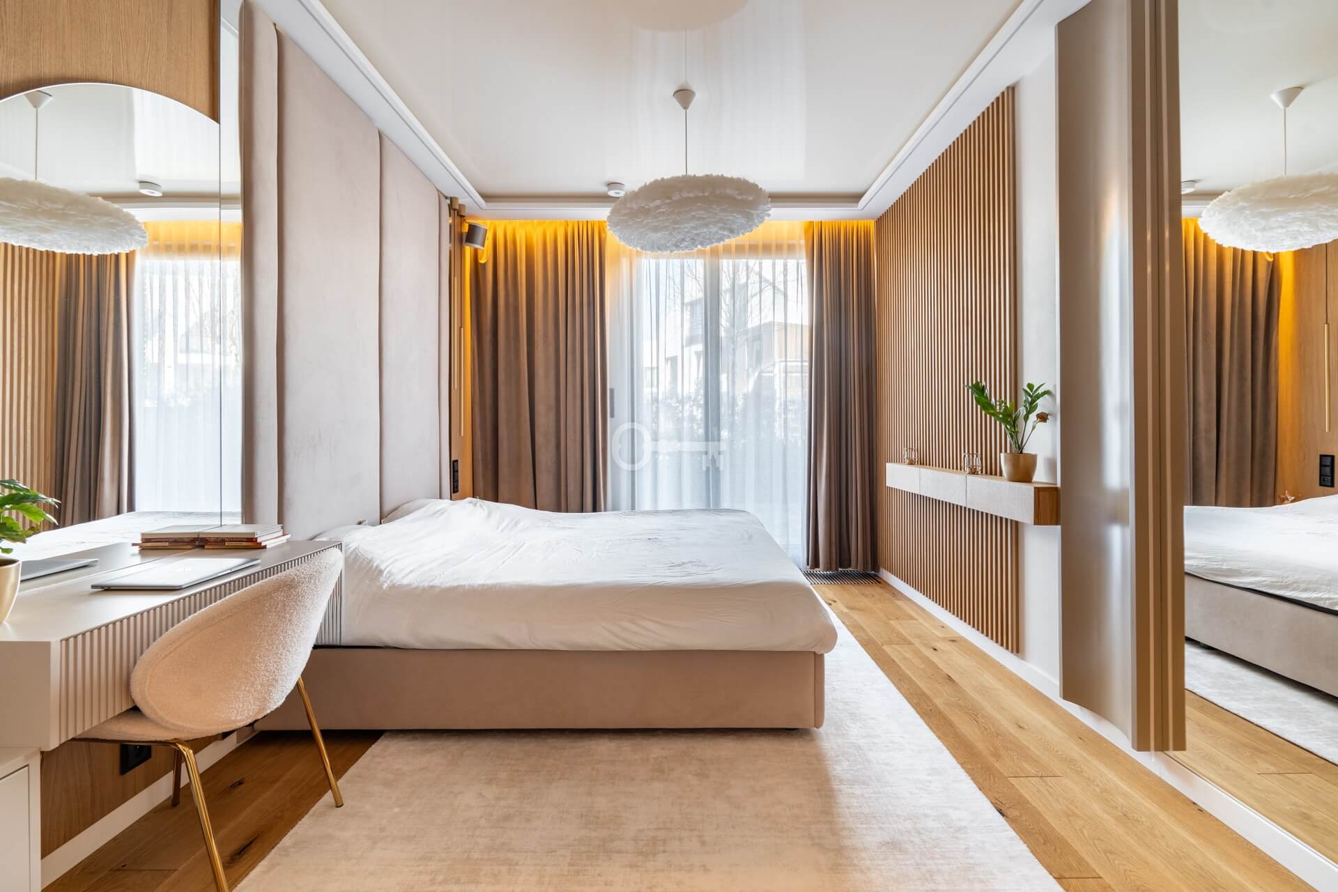* Reprezentacyjna sypialnia z wysokim, tapicerowanym zagłówkiem sięgającym sufitu, lustrzanymi panelami oraz drewnianymi detalami