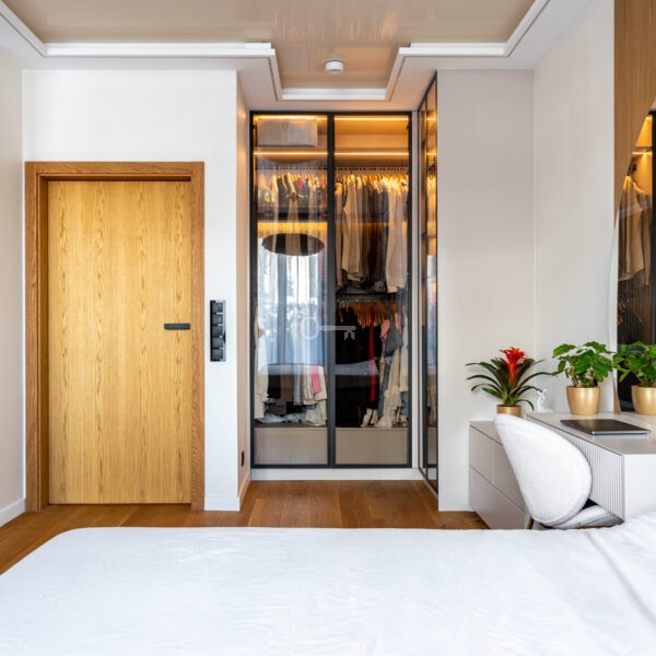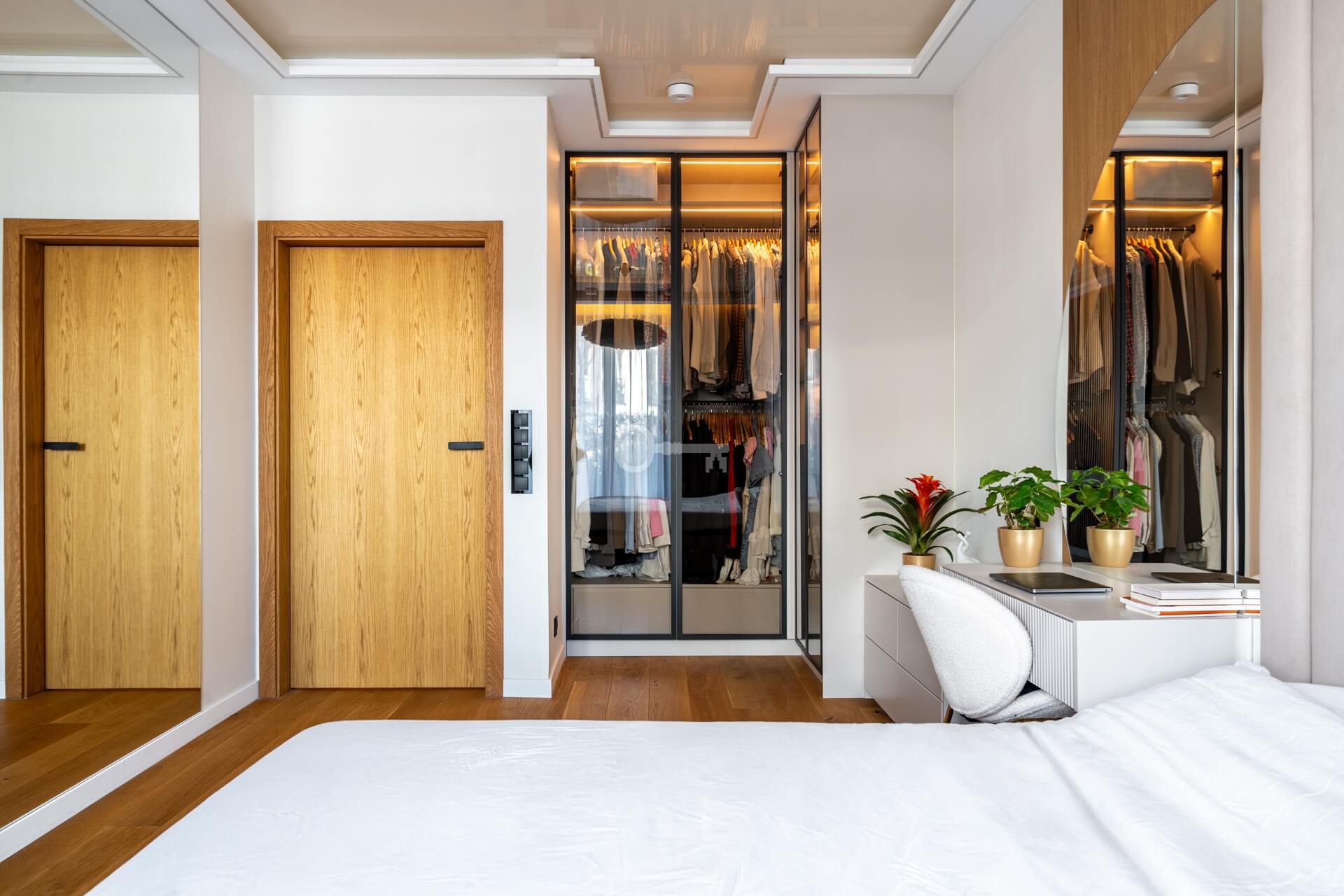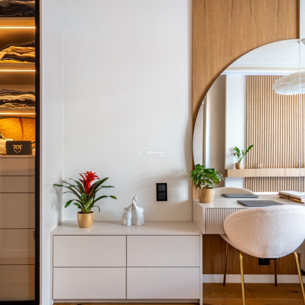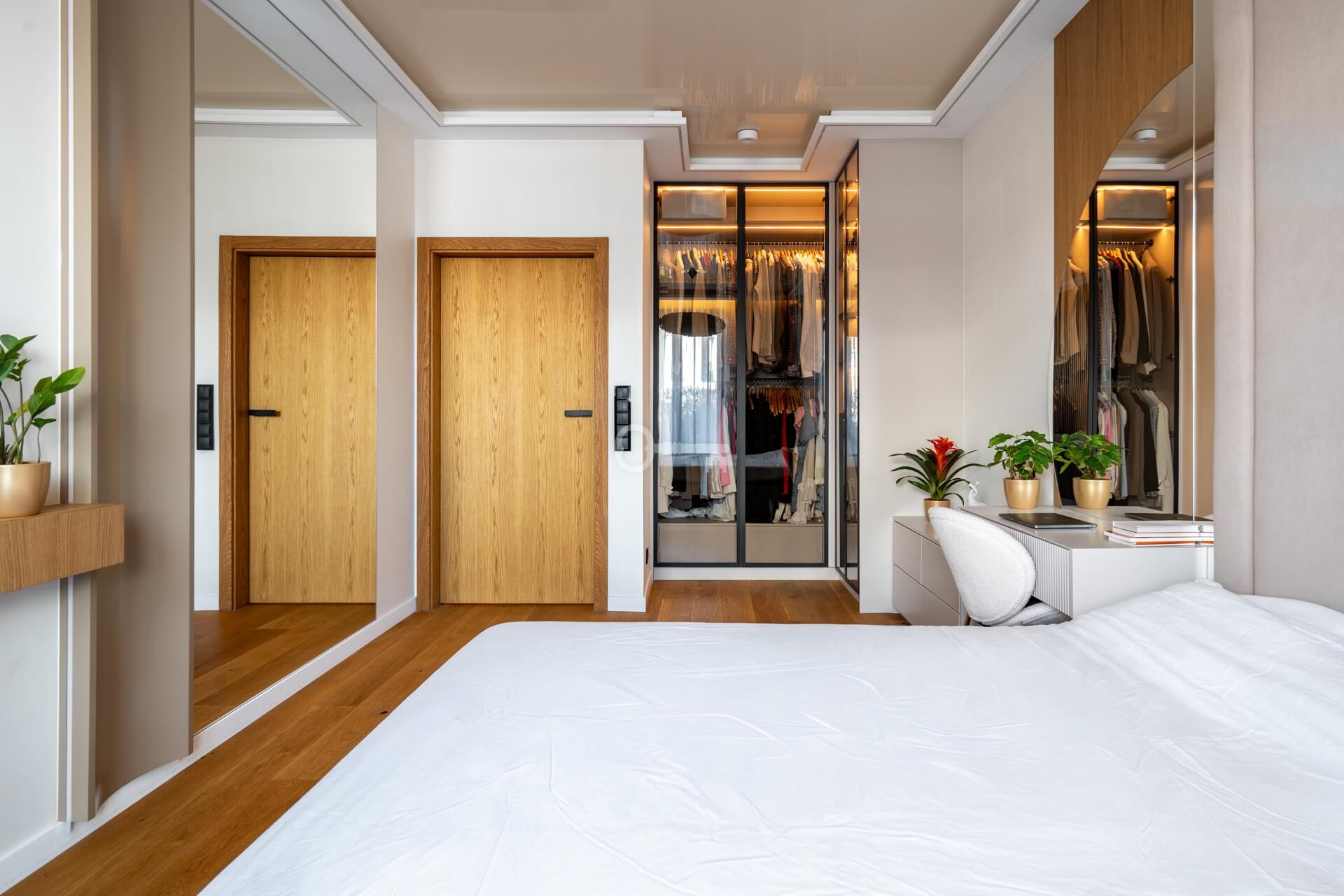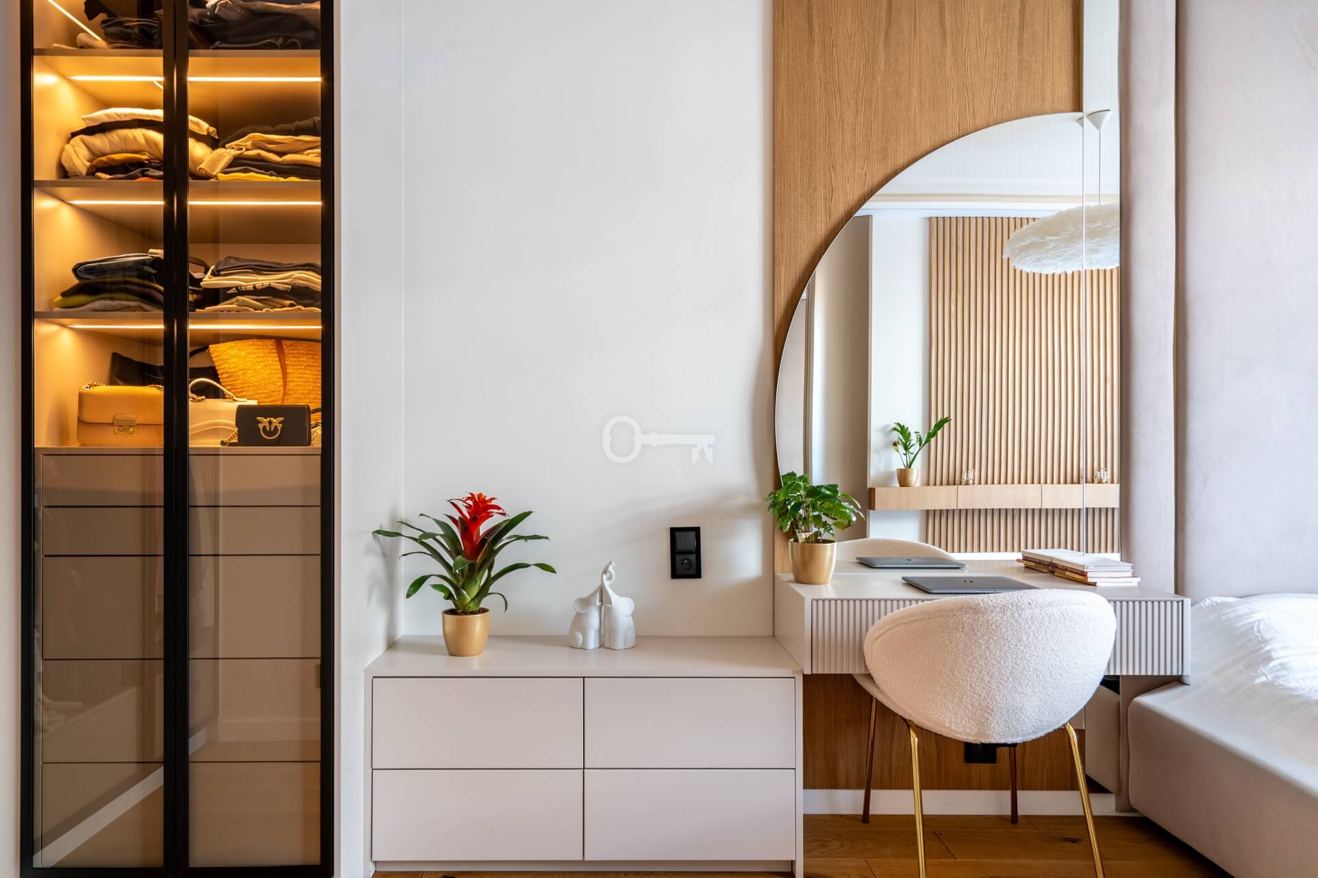 * Stylowa toaletka z okrągłym lustrem oraz przeszklona garderoba