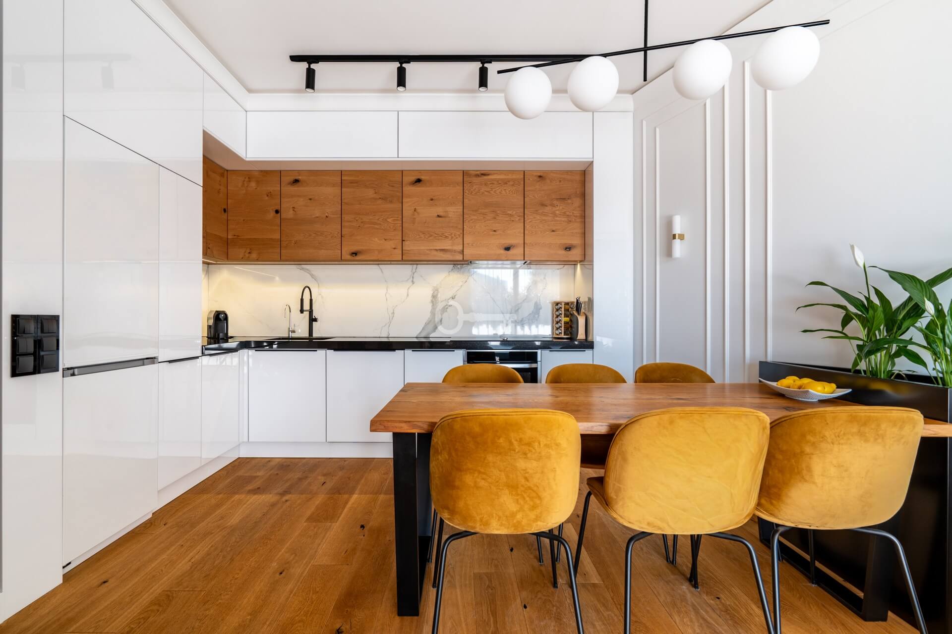 * Kuchnia wykonana na wymiar – połączenie naturalnego drewna z nowoczesną, białą zabudową
