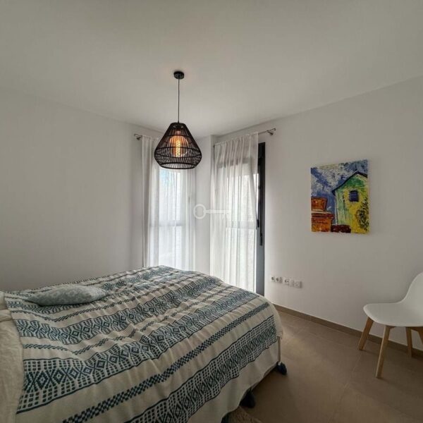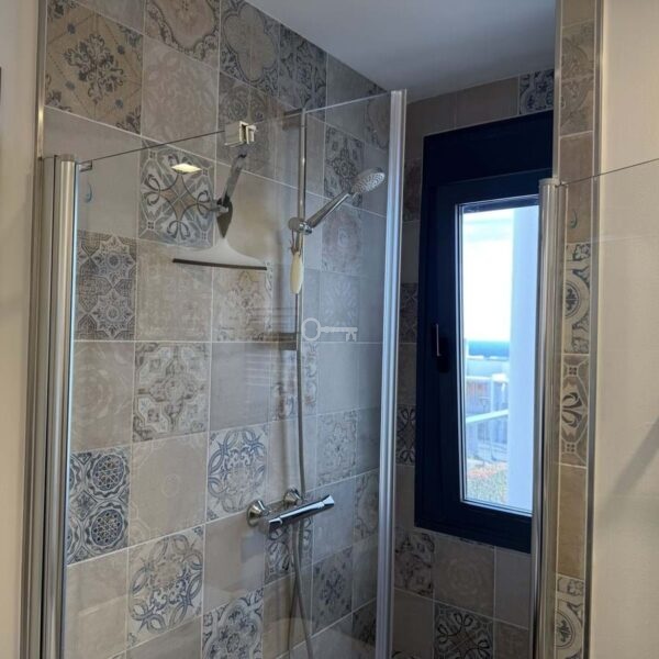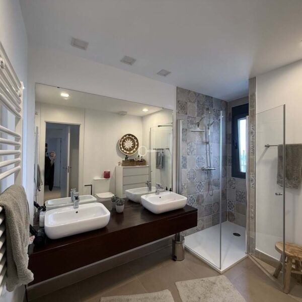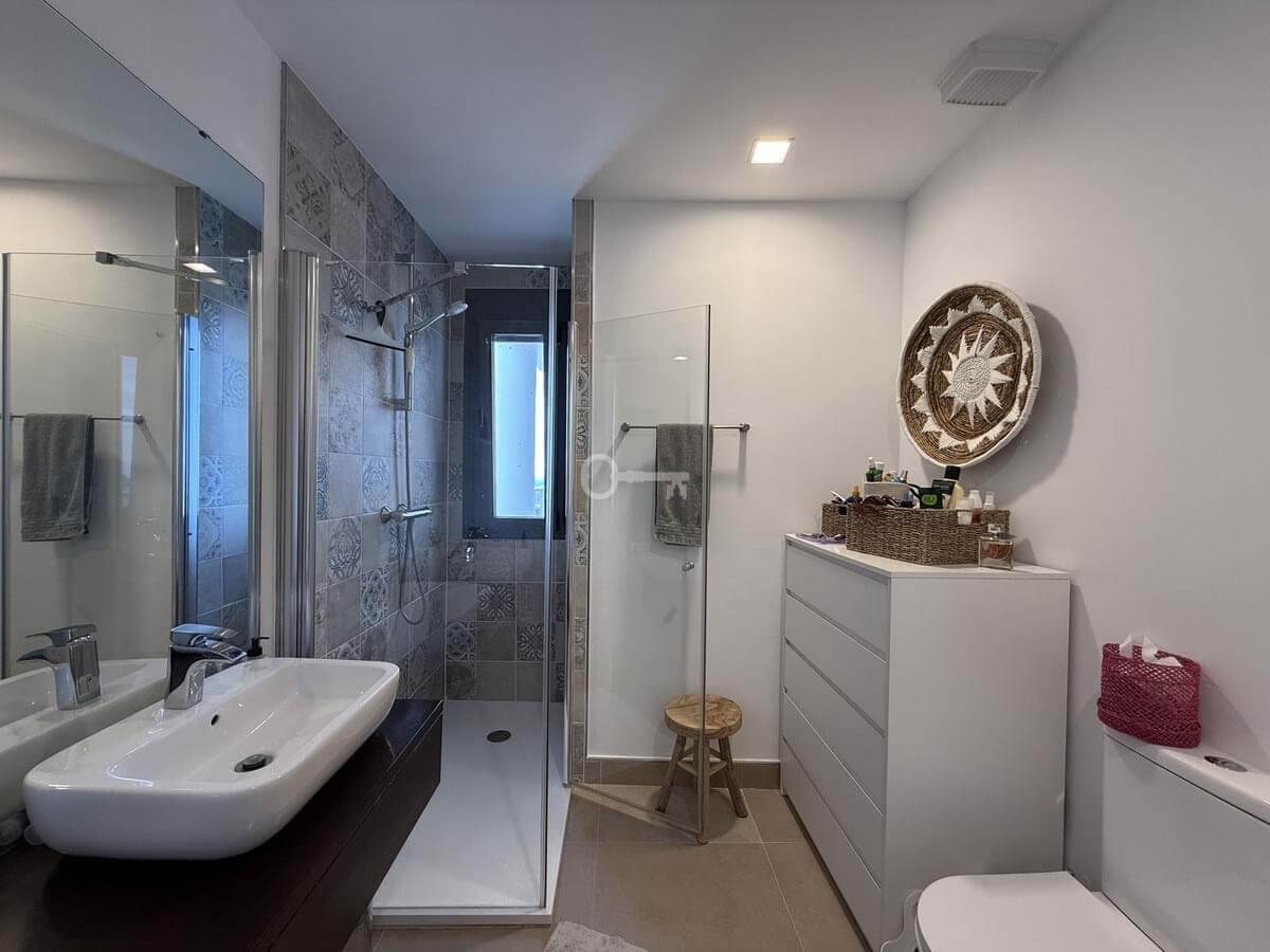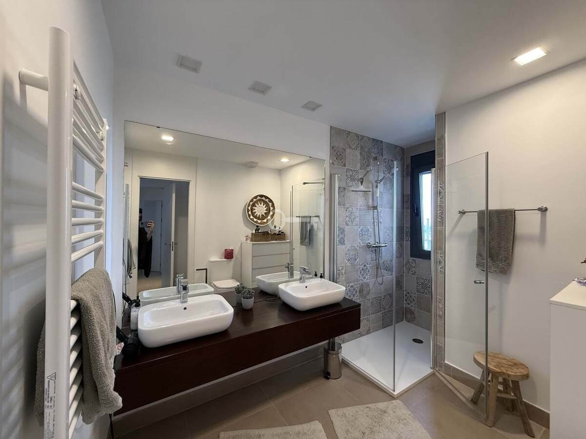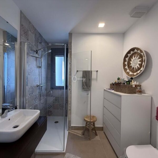 The night area consists of a master suite with sea views, built-in wardrobes, a double bed, and an elegant en-suite bathroom with a walk-in shower and a window to enjoy the views while showering. Additionally, there are two spacious guest bedrooms, each with a double bed and nightstands, all with built-in wardrobes and views of the gardens. These share a full bathroom with a walk-in shower.