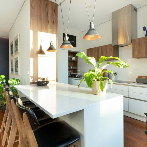 Salon i otwarta kuchnia z półwyspem do spożywania posiłków