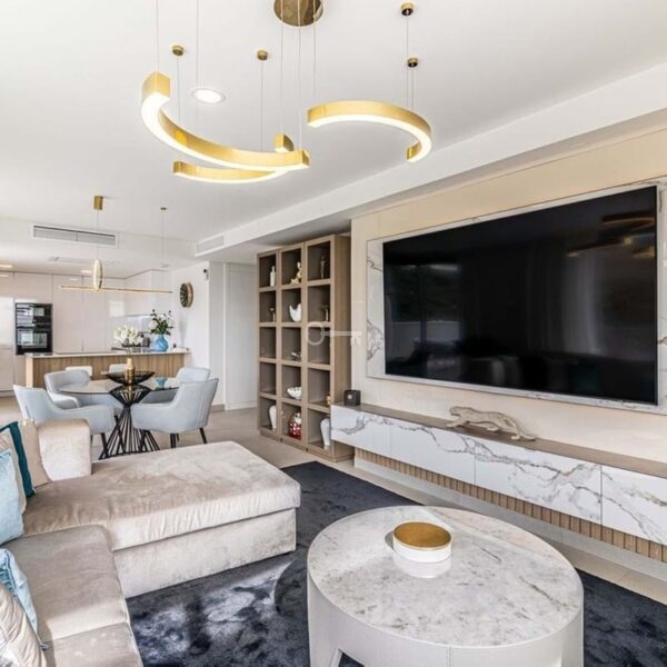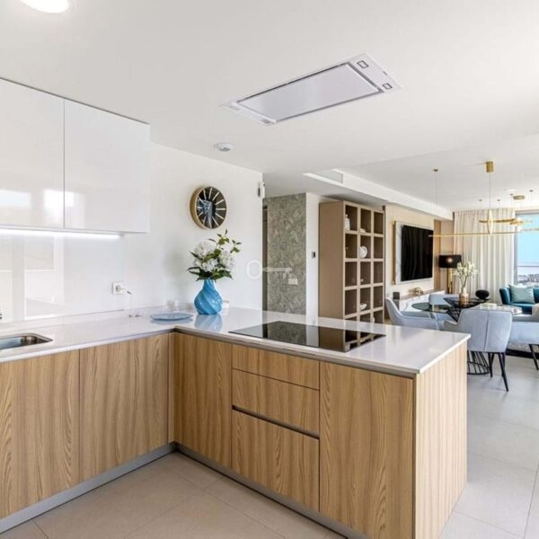 Wewnątrz penthouse oferuje jasny i przestronny salon z jadalnią, w pełni wyposażoną kuchnię na otwartym planie oraz dwie eleganckie sypialnie, z których każda ma własną łazienkę, uzupełnioną stylową toaletą dla gości.