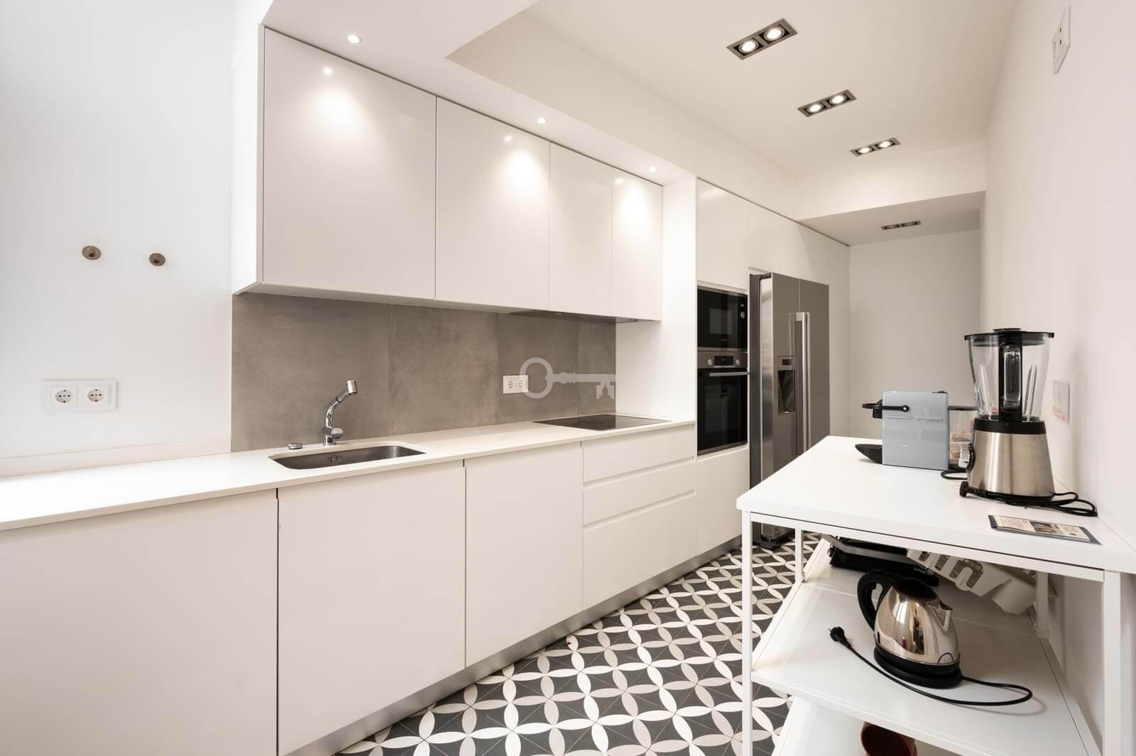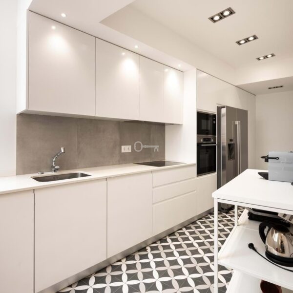Kuchnia została zaprojektowana z myślą o funkcjonalności i estetyce. W pełni wyposażona w najnowocześniejszy sprzęt AGD, taki jak szklano-ceramiczna płyta grzewcza i wentylator wyciągowy, oferuje praktyczność niezbędną do codziennego życia bez uszczerbku dla współczesnego i eleganckiego designu. Doskonała integracja z resztą mieszkania tworzy atmosferę płynności i harmonii.