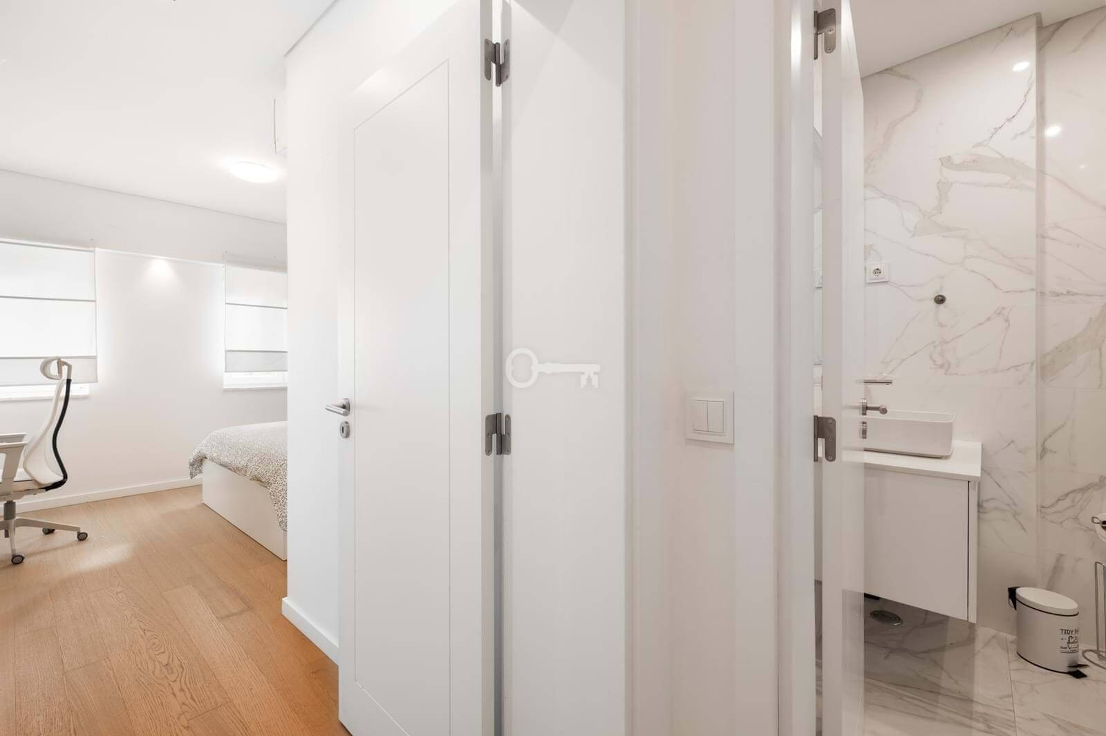 Apartament główny to prawdziwa oaza spokoju. Dzięki nowoczesnemu designowi oferuje maksymalny komfort i prywatność. Przestrzeń obejmuje również prywatną łazienkę z luksusowymi wykończeniami i najwyższej jakości materiałami, zapewniając atmosferę spokoju i dobrego samopoczucia.