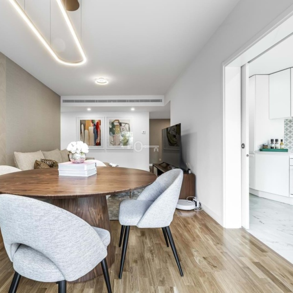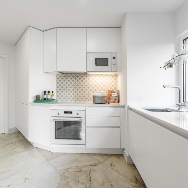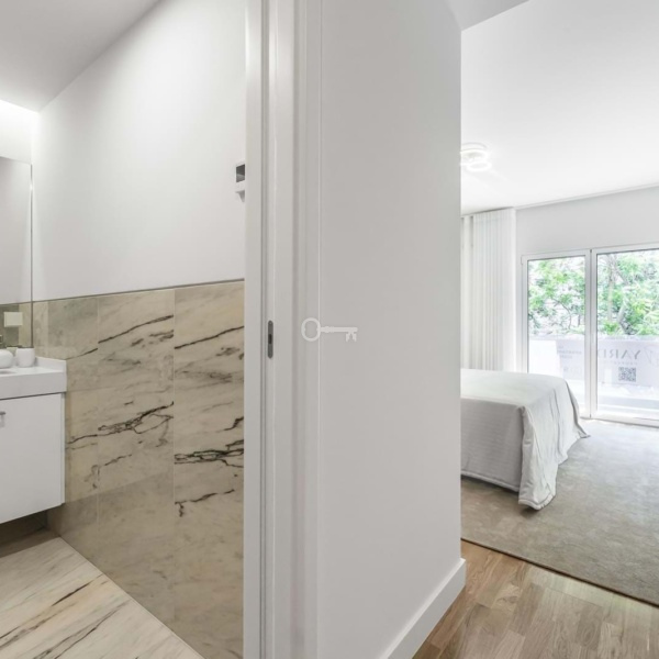 Kuchnia: W pełni wyposażona w urządzenia SCIC Italian Design, blaty Silestone, marmurową podłogę Estremoz i przesuwane drzwi łączące z salonem dla płynnej i wszechstronnej przestrzeni.