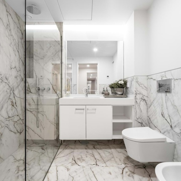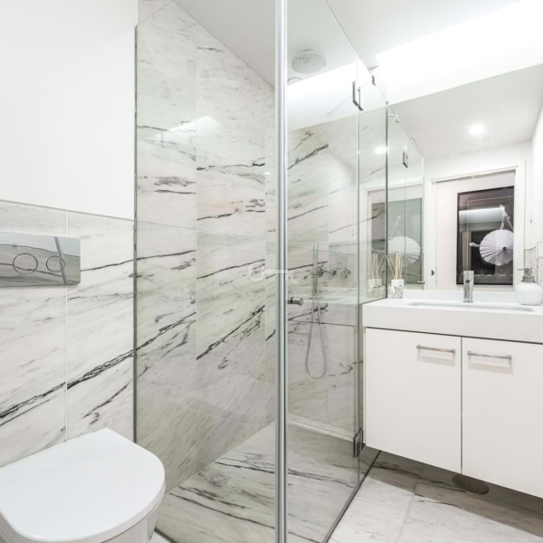 Łazienka: armatura Sanidusa, marmurowe ściany, podłoga i kabina prysznicowa