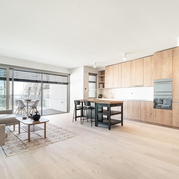 Składa się z małego przedpokoju, kuchni wyposażonej w sprzęt AGD marki SMEG w otwartej przestrzeni z salonem i dostępem do dużego balkonu o powierzchni 22 m2, z którego można podziwiać widoki.