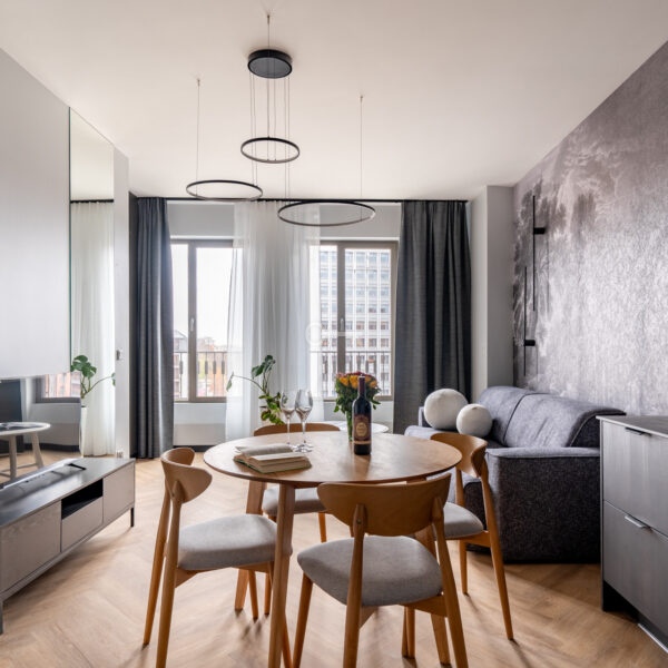Lokal jest kompletnie wykończony oraz gotowy do zapraszania gości. W pełni wyposażona nieruchomość pod kątem mebli ruchomych, szaf zabudowy kuchennej, sprzętu RTV oraz AGD. W każdym z lokali stolarka została wykonana przez stolarza pod wymiar.