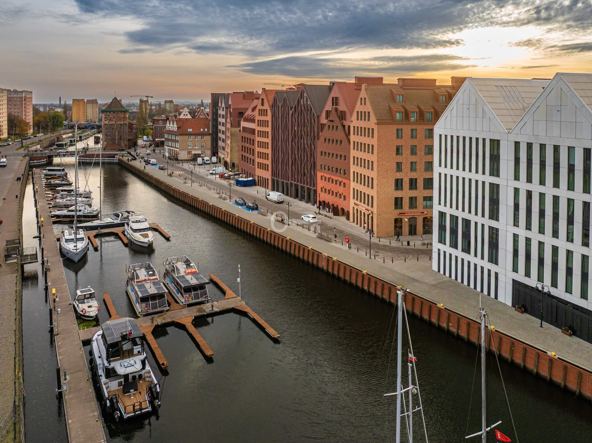 Projekt harmonijnie łączy nowoczesną architekturę z historycznym charakterem tego miejsca, oferując wyjątkowe przestrzenie mieszkalne i usługowe w jednej z najbardziej atrakcyjnych lokalizacji miasta. Duże okna w większości lokali zapewniają widoki na Stare Miasto i odrestaurowane zabytkowe spichlerze.