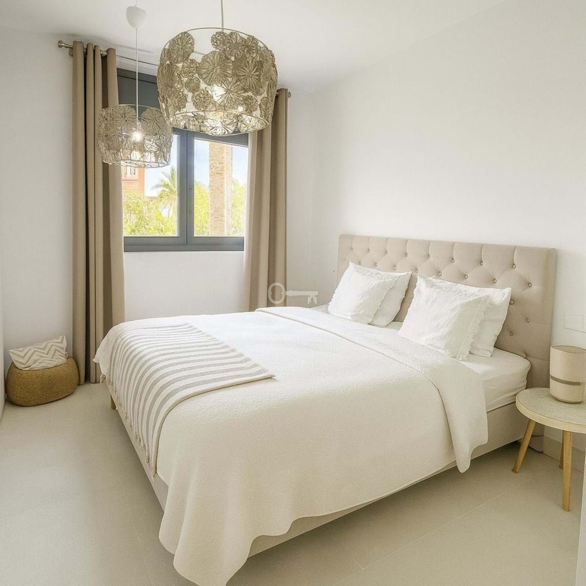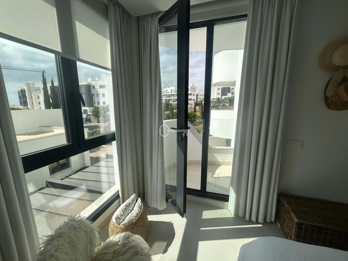 Przestronny salon i jadalnia płynnie łączą się z tarasem, tworząc jasną i przestronną atmosferę. Apartament główny posiada własną łazienkę i garderobę, a dwie dodatkowe sypialnie dzielą nowoczesną łazienkę rodzinną. W pełni wyposażona kuchnia z wysokiej jakości sprzętem AGD uzupełnia układ, w tym nowoczesny bar ze stołkami barowymi.