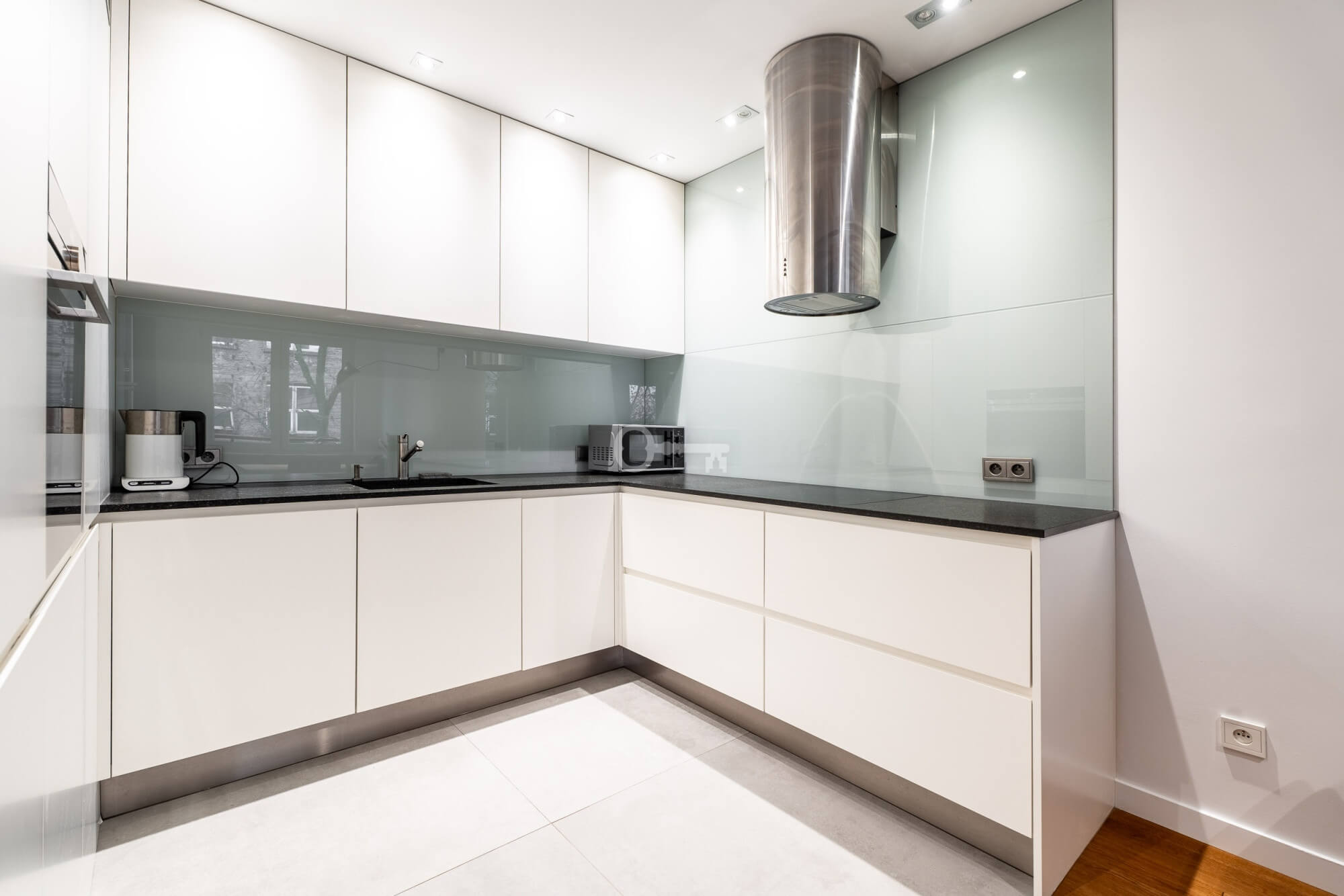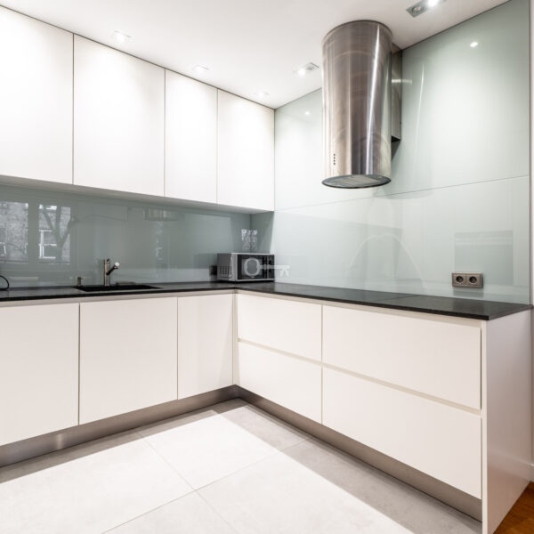 W salonie znajduje się również wyjście na balkon. Nowoczesna, w pełni wyposażona kuchnia. Widoczny okap, płyta, mikrofalówka, zmywarka Zabudowa kuchenna utrzymana w bieli, z czarnymi blatami i jasnoszarym szklanym panelem ściennym.