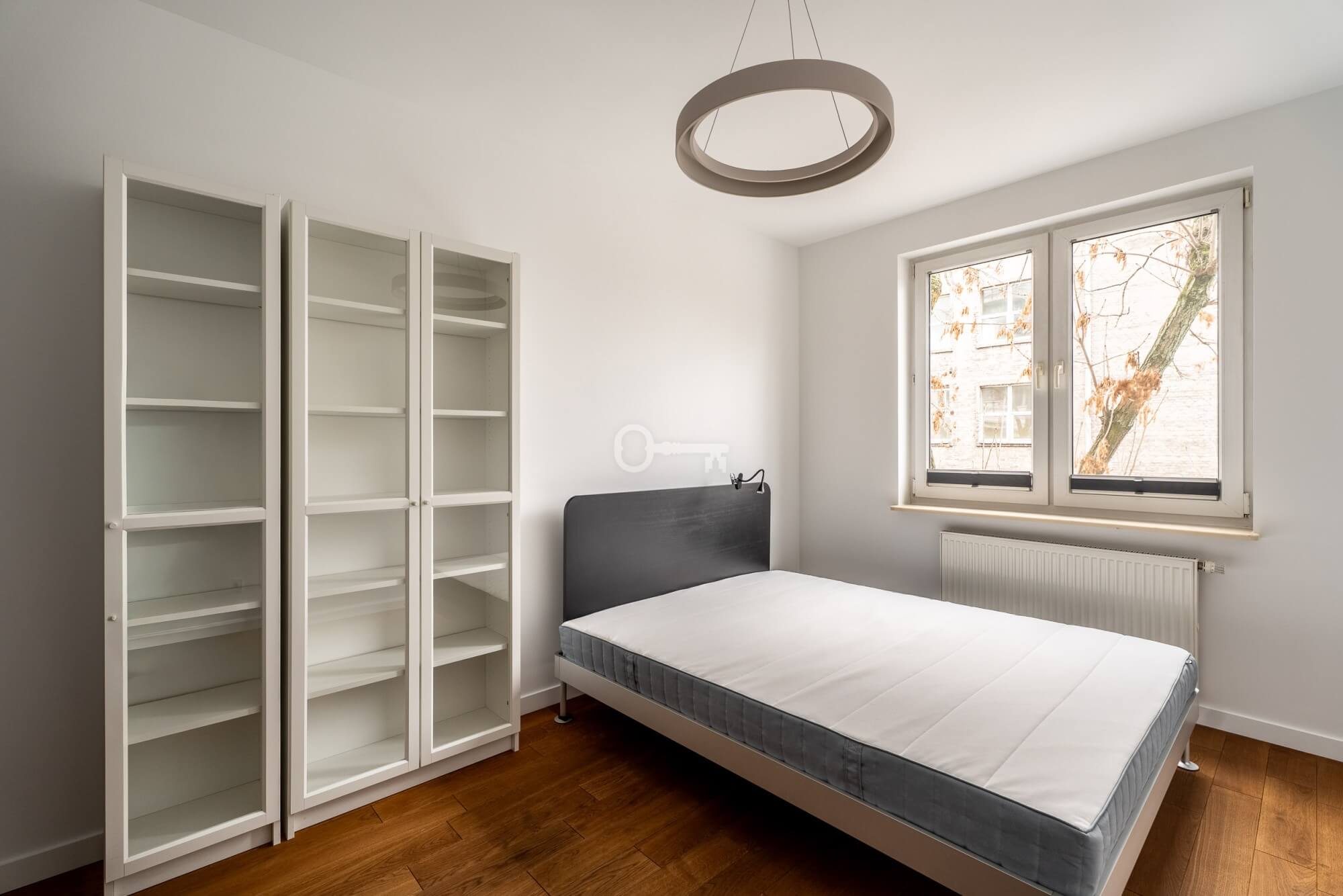 Sypialnia to jasne i spokojne pomieszczenie z dużą ilością miejsca do przechowywania dzięki dwóm pojemnym regałom/szafom, z jedną częścią z przeszklonymi drzwiami. Łazienka wykończona w nowoczesnym stylu, z dużą lustrzaną ścianą. Do dyspozycji jest również oddzielna, pojemna garderoba z otwartymi półkami.