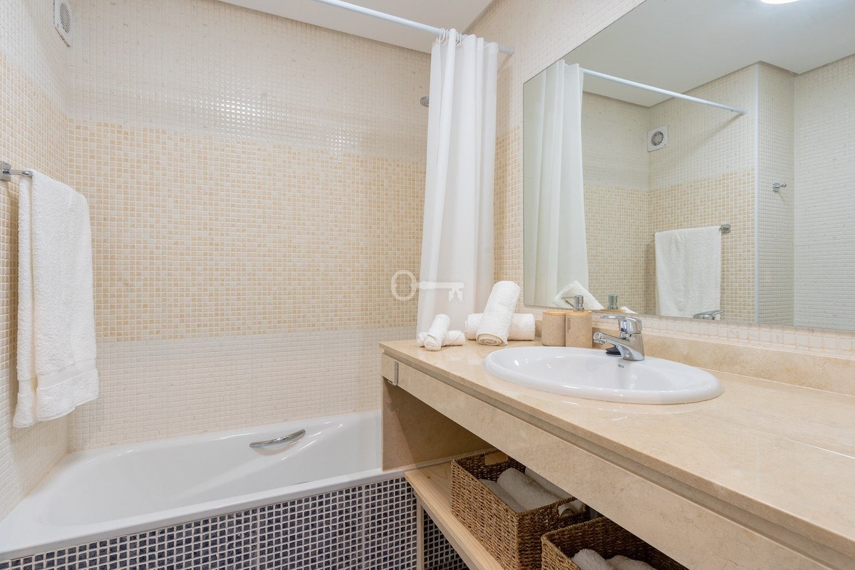 Ten jasny i przytulny apartament oferuje 2 sypialnie i 2 łazienki, położone na terenie strzeżonego osiedla z prywatnym parkingiem, dostępem do windy i pięknie utrzymanymi ogrodami. Duże okna wypełniają dom naturalnym światłem i otwierają się na malownicze widoki na góry i wspaniały wspólny basen w stylu organicznym.
