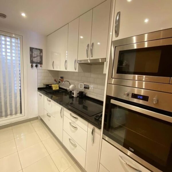 The layout comprises an entrance hall leading to the spacious and generous living-dining room, a fully fitted kitchen with top-of-the-range appliances and a separate utility room, a master bedroom with a newly refurbished en-suite bathroom and access to a reading room or study, a secondary bedroom, and a newly refurbished bathroom with high-quality porcelain finishes.