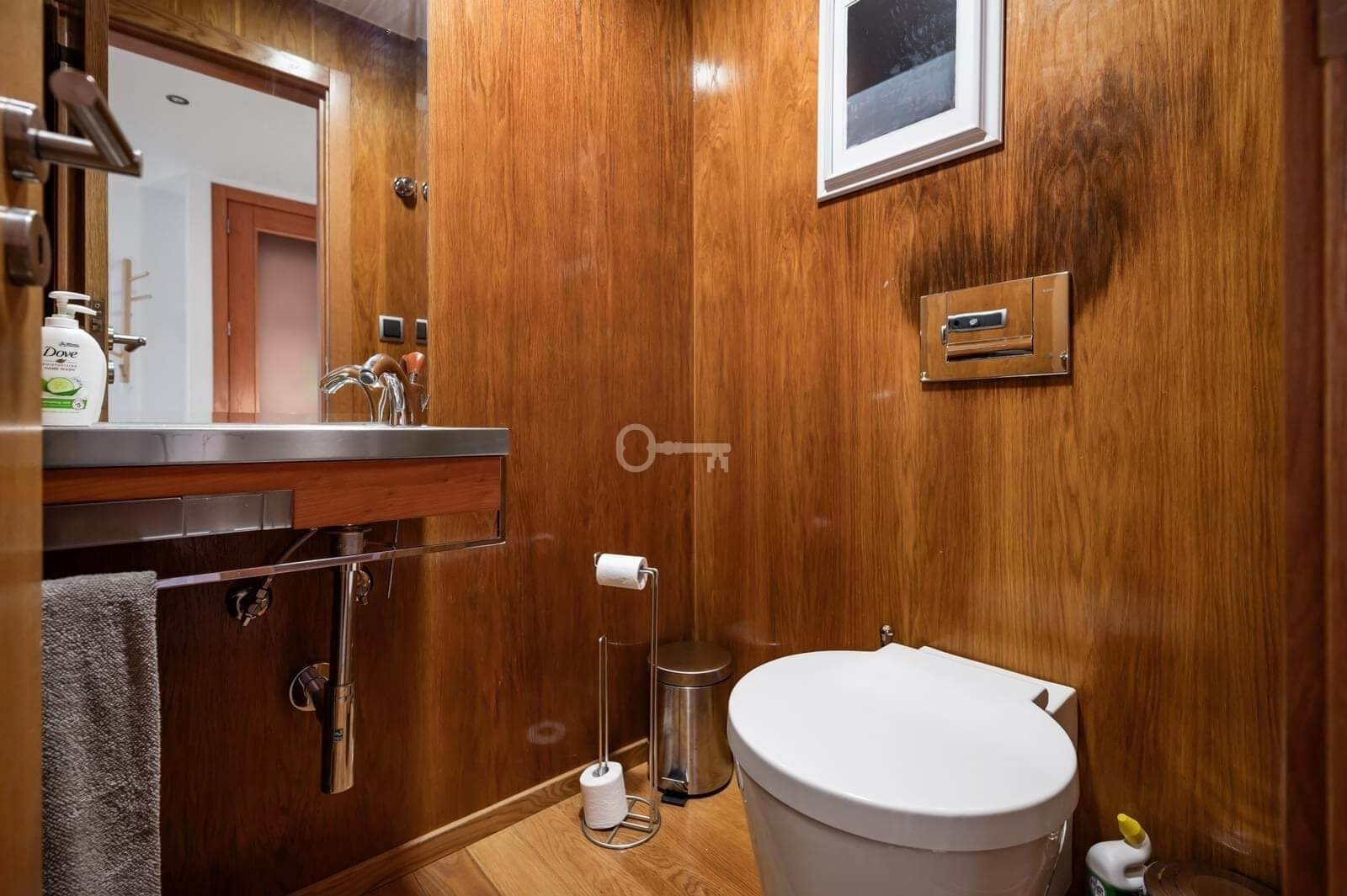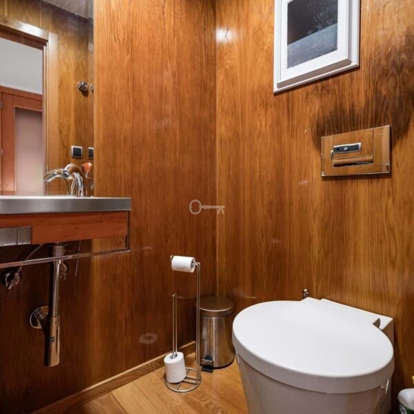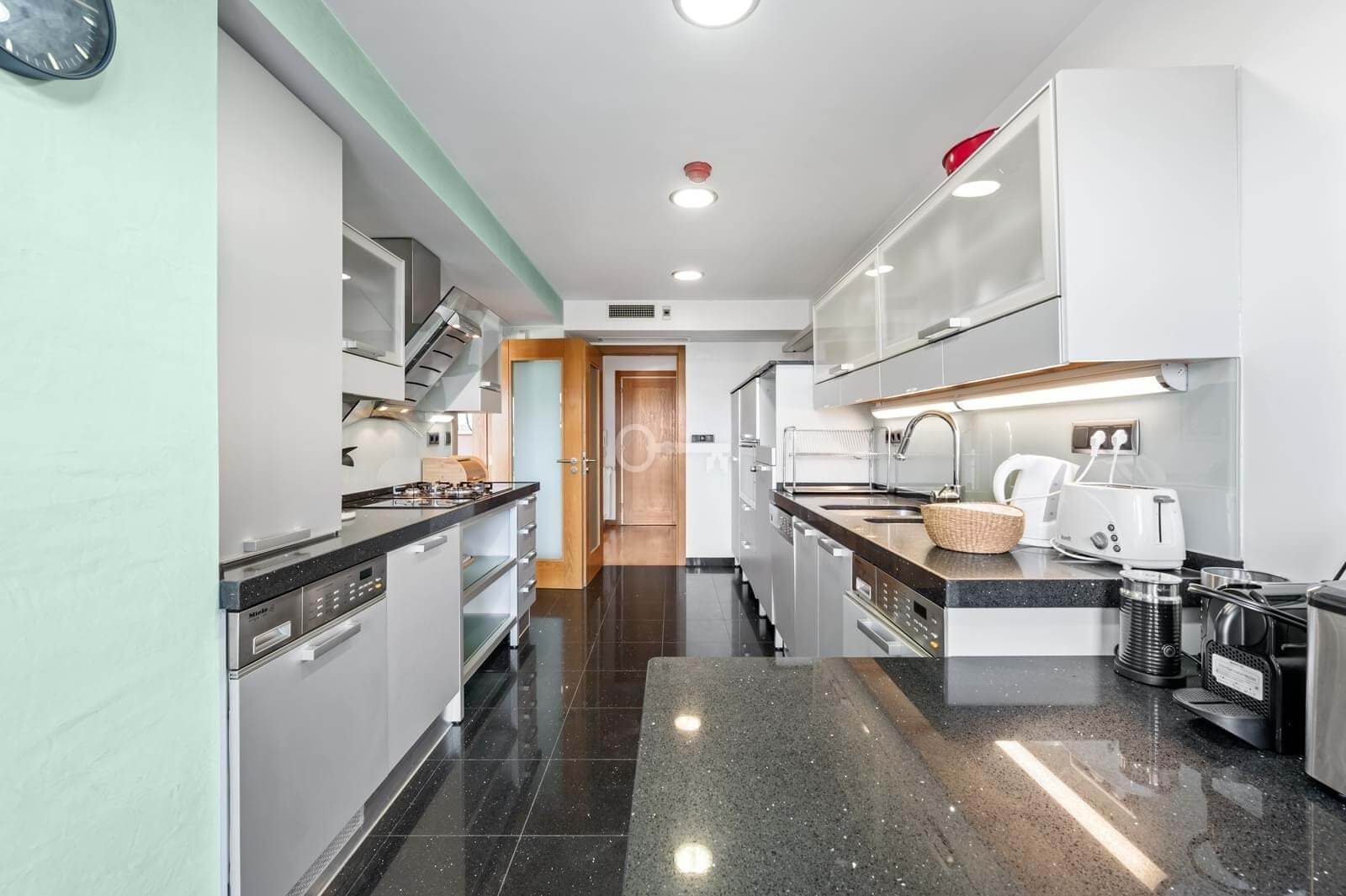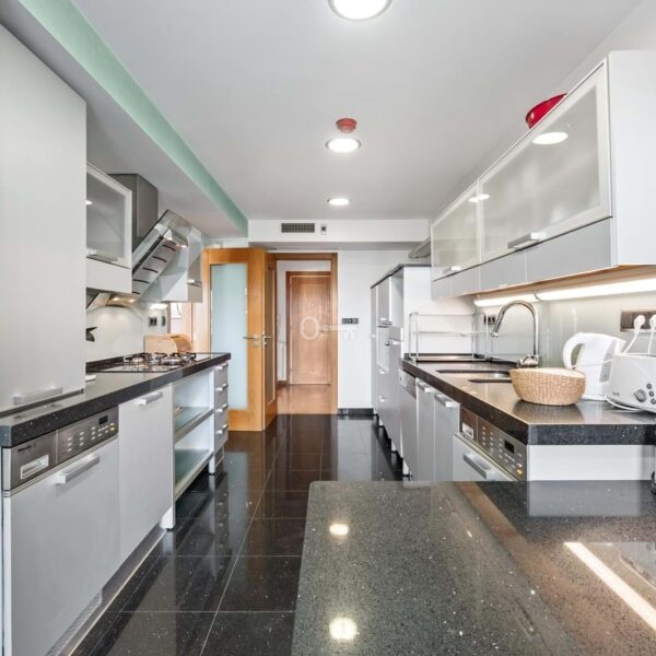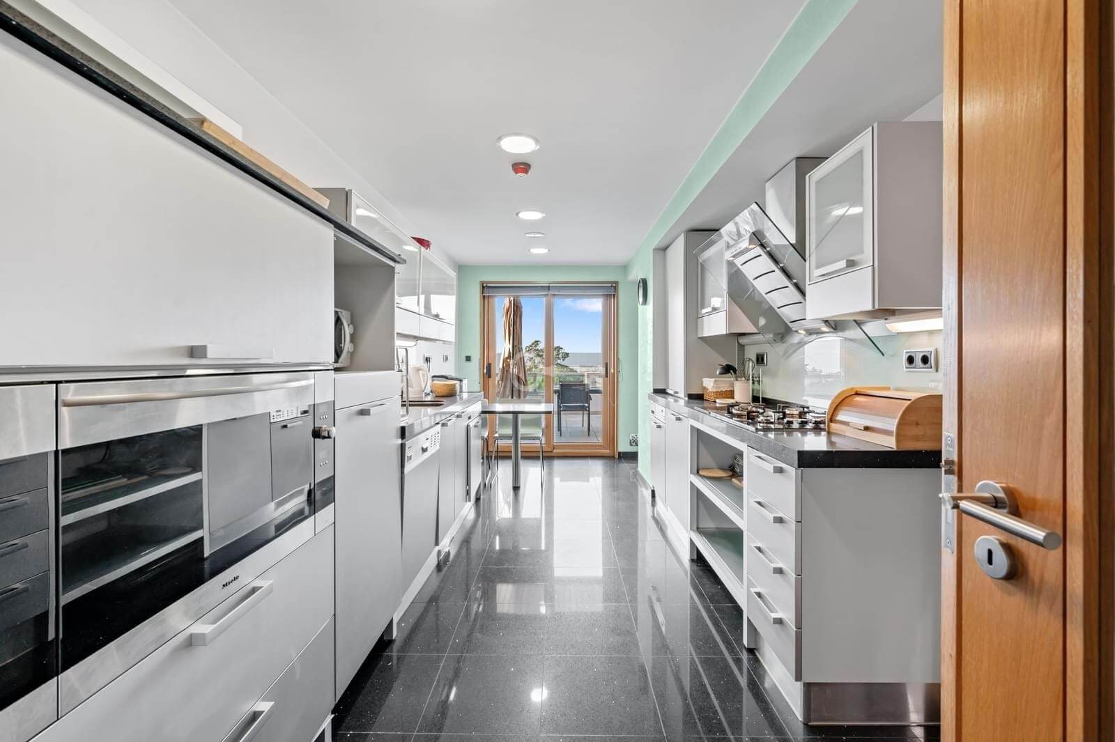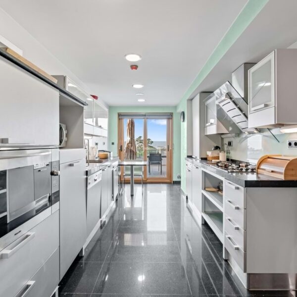 The social area features a 45 sqm living room with fireplace and direct access to the terrace, perfect for enjoying the sea view. The kitchen is fully equipped with Miele appliances and includes a pantry.
