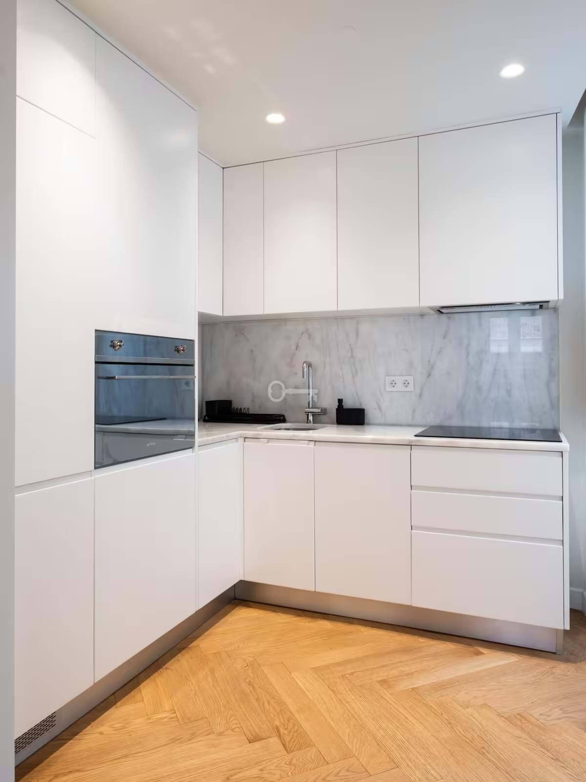 The apartment is sold partially furnished, equipped with air conditioning and a kitchen with SMEG brand appliances.