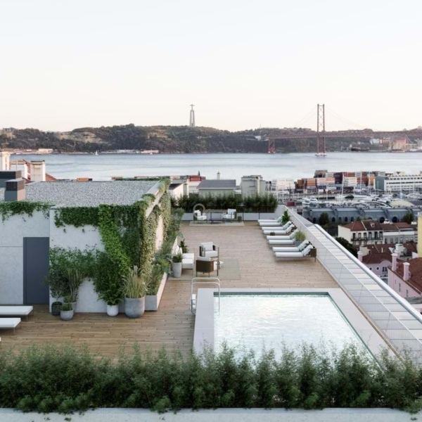 Kondominium Infante Residences ma wyłączny dostęp do eleganckiego dachu z basenem i częścią rekreacyjną, idealną do podziwiania panoramicznych widoków na stolicę i rzekę Tag.
