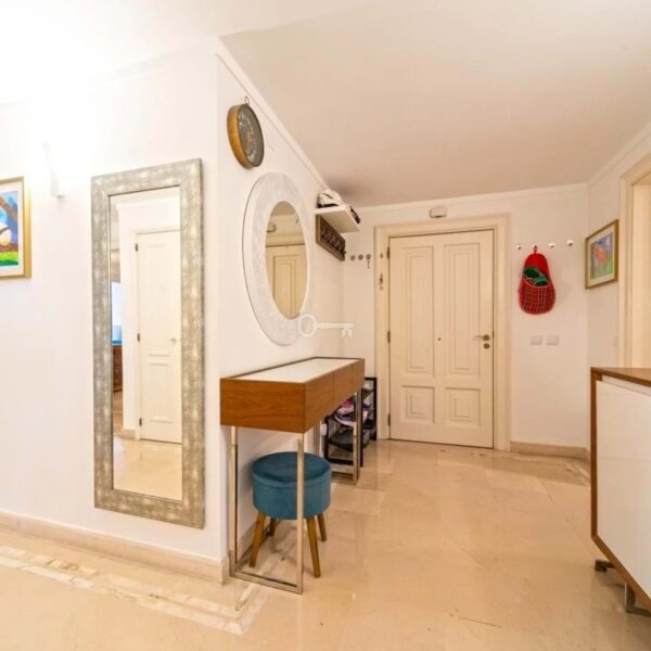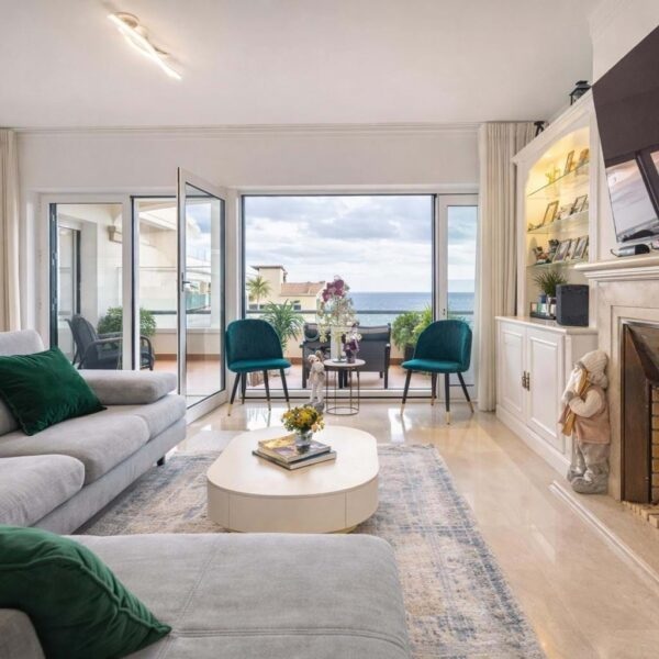 2-bedroom apartment offers a fantastic living experience with comfort and quality of life. It features an entrance hall, a spacious living room with a fireplace, and direct access to a balcony with a stunning front sea view. The kitchen is modern, fully equipped, and includes a separate laundry area. The apartment has two suites, one with a walk-in closet and the other with access to the balcony.