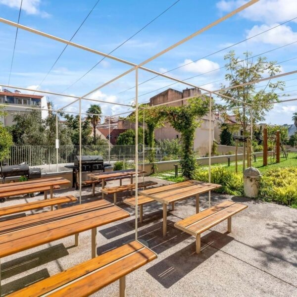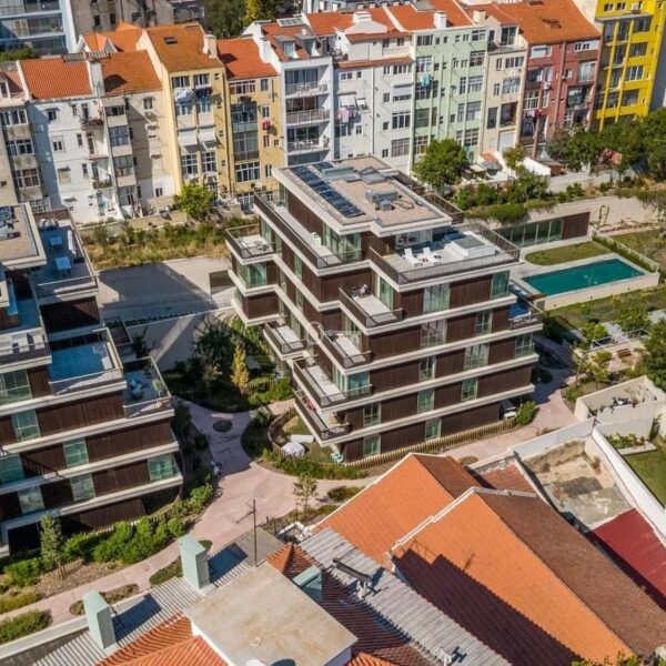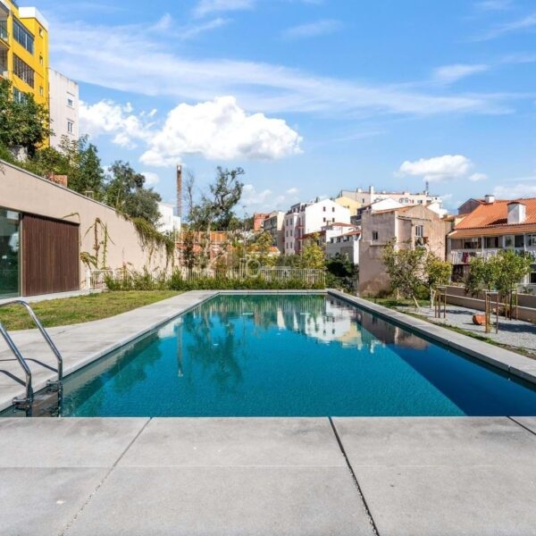 With concierge, two swimming pools, one outdoor and one indoor lined with Viúva Lamego tiles, SPA, playground, community garden, and a meticulously planned garden with small pathways and seating/meditation areas.