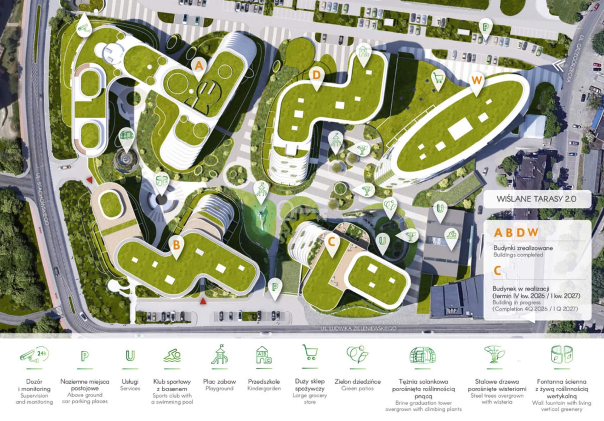 * Rekreacja: Zielone dziedzińce, nowoczesne place zabaw, alejki spacerowe i pergole.