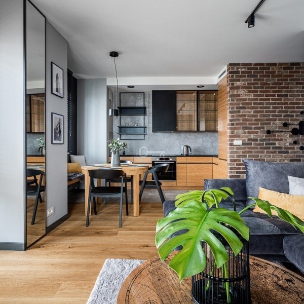 Całe mieszkanie utrzymane jest bardzo konsekwentnie w naturalnych tonach: dębowego brązu, szarości, miedzi a pojedyncze akcenty kolorystyczne nadają ciepła i podkreślają jego wyjątkowość.