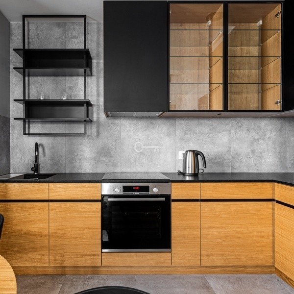 Apartament wykończony został z pełną dbałością o szczegóły przez architekta. Szafy w zabudowie robione na specjalne zamównienie. Ponadto umeblowanie takich marek jak: TakeMeHome oraz Woodica.