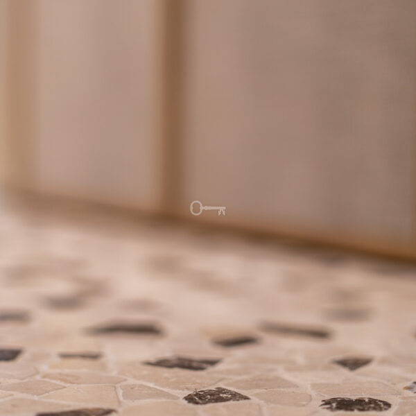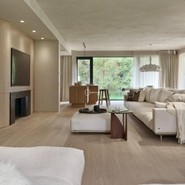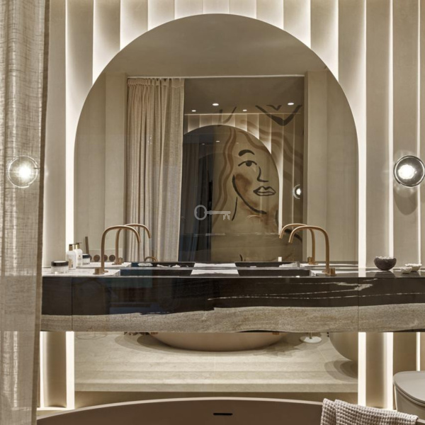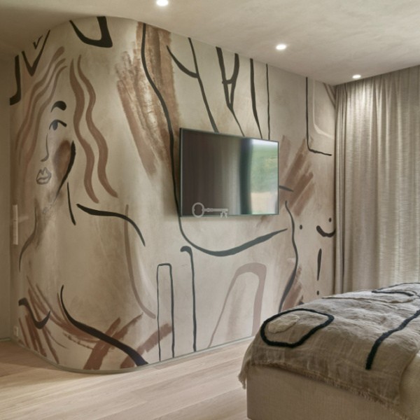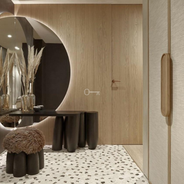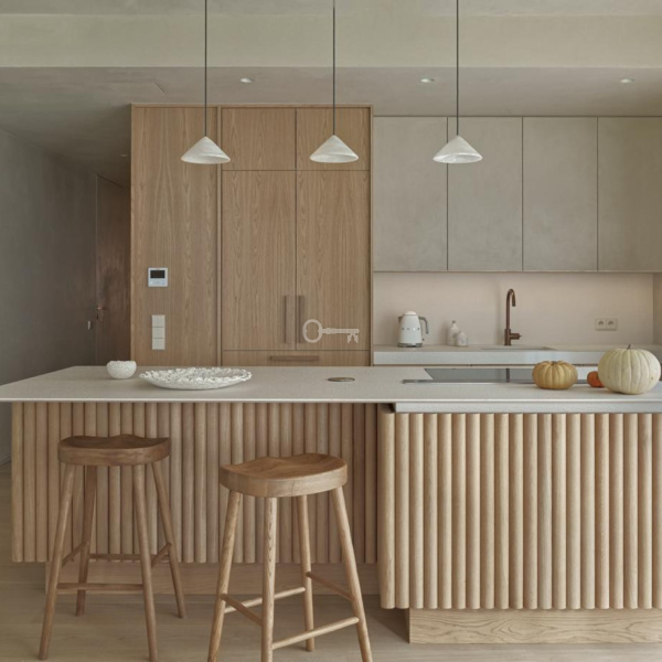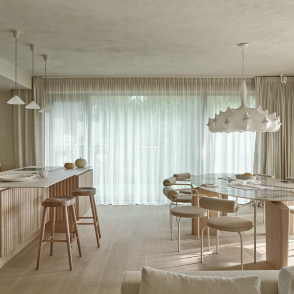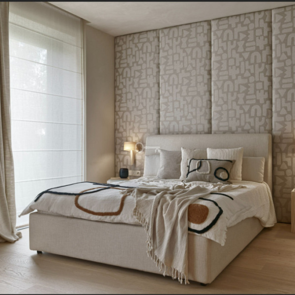 Apartament wykończony z najwyższej jakości materiałów, takich jak drewniane podłogi i kamienne blaty w kuchni oraz łazienkach. Styl łączy elementy Boho i Japandi, z ręcznie malowanym muralem i stylowymi tapetami. Okna na całą ścianę zapewniają dużo światła i widok na Zatokę. Wykończenie obejmuje dyskretne drzwi, ogrzewanie podłogowe oraz szafy na zamówienie. Wnętrze spójne, z dużą ilością drewna i kamienia.