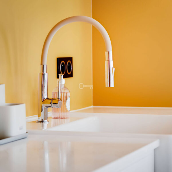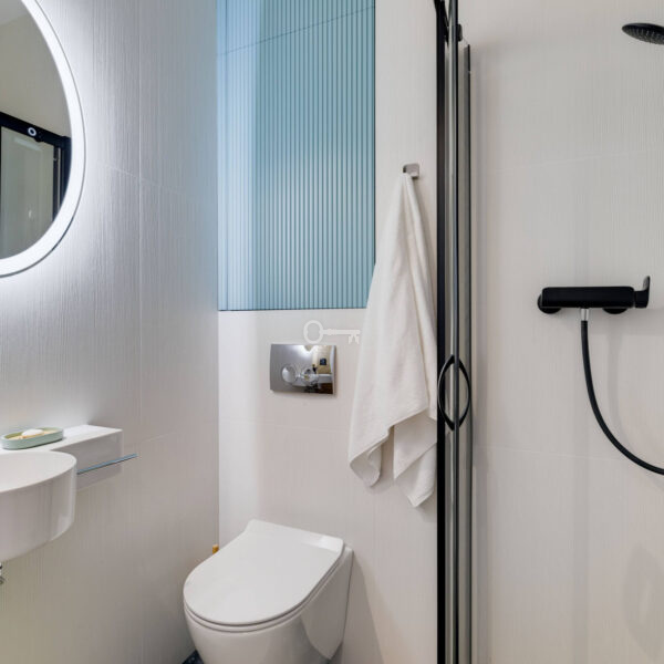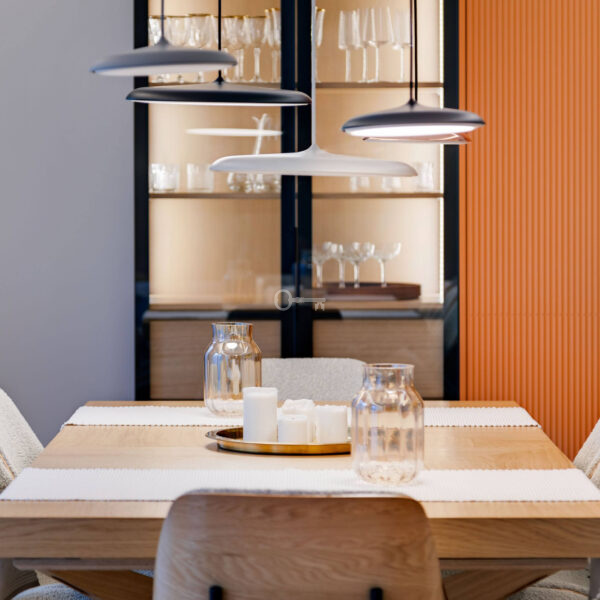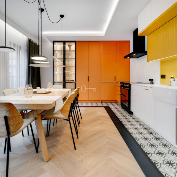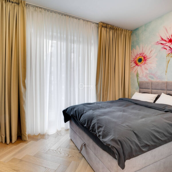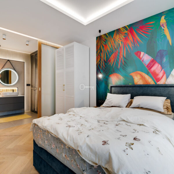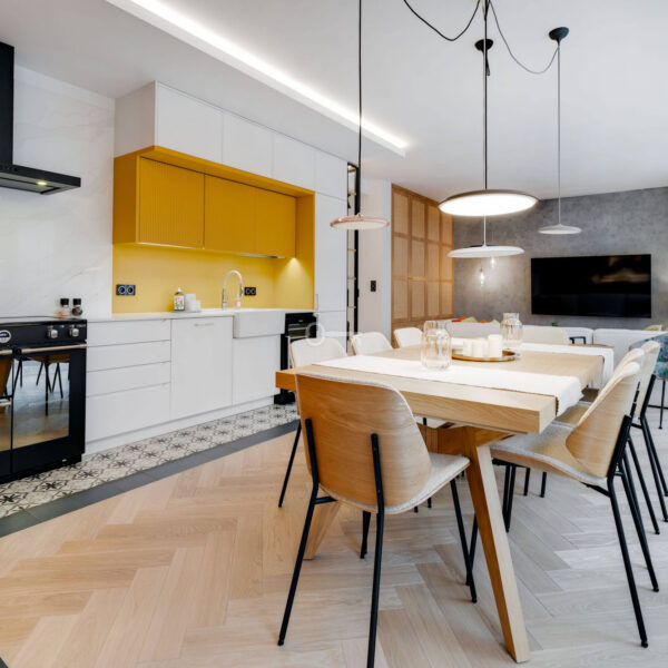 W kuchni znajduje się dużo wolnej przestrzeni do przygotowywania posiłków, najwyższej klasy sprzęt AGD: piekarnik, zmywarka, płyta indukcyjna. Otwarta na salon kuchnia dodaje wnętrzom charakteru. Przestrzeń dzienna idealnie spełnia funkcję przestrzeni wypoczynku dla całej rodziny – duży stół, wygodna kanapa. W głównej sypialni znajduje się własną łazienka z wygodną, przestronną kabiną prysznicową.