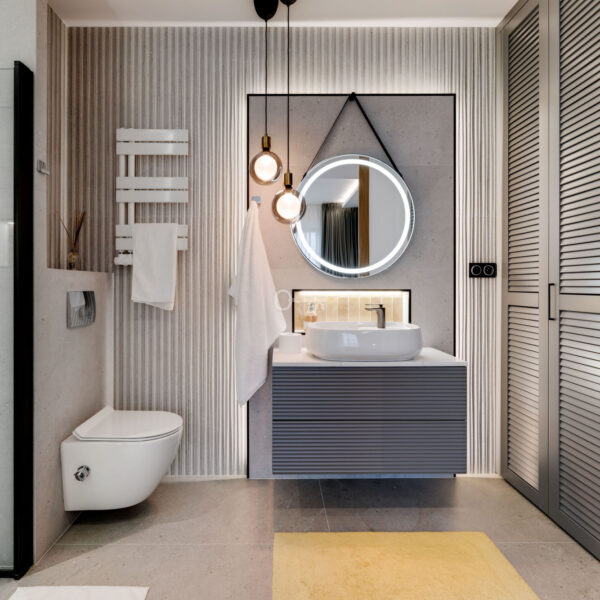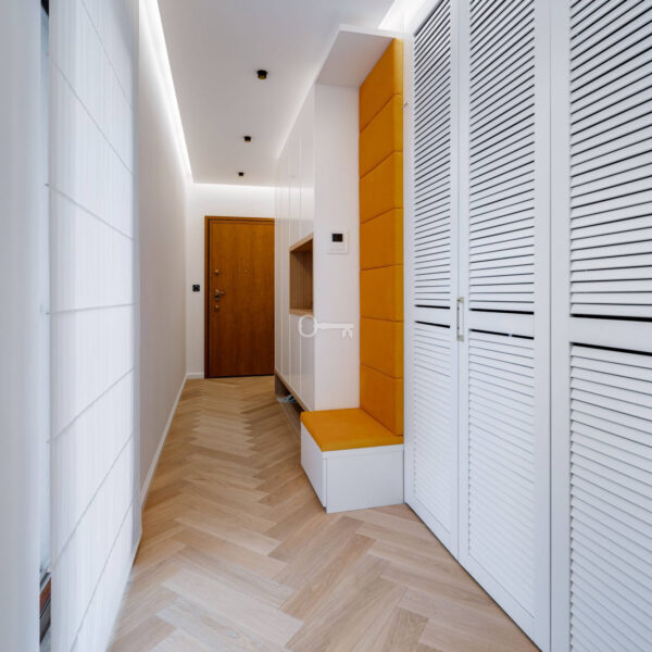 Całość utrzymana w spójnej kolorystyce. W hallu wejściowym znajduje się przestronna szafa w zabudowie. Charakter wnętrz podkreśla zaprojektowane według indywidualnych potrzeb oświetlenie.